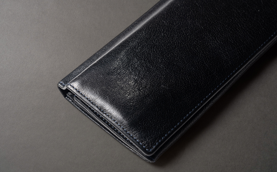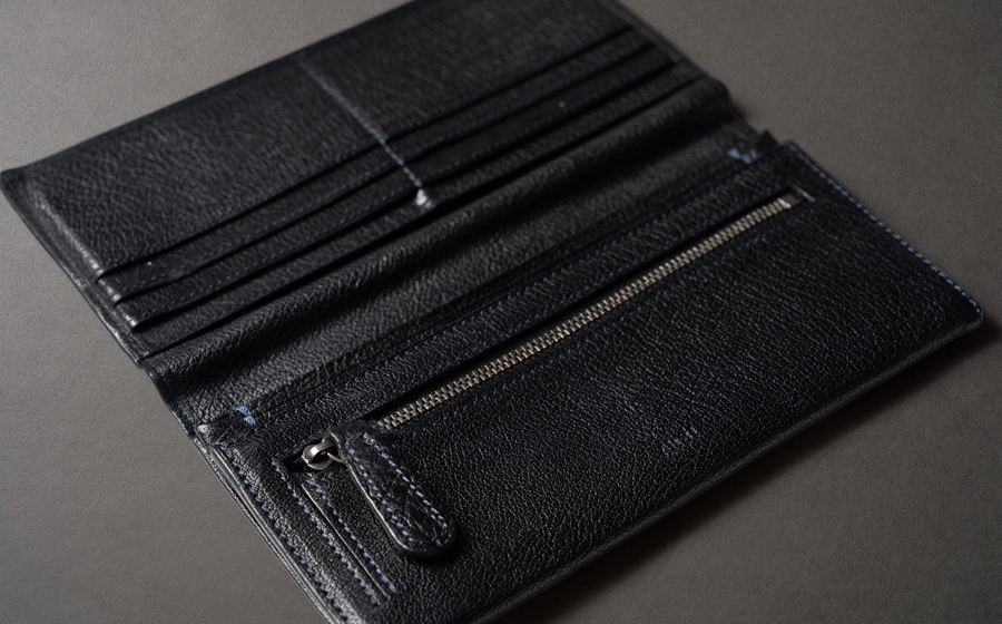 A.まず、この長財布を買おうと思った1番の理由が小銭入れです。いろいろと見てるけど、なかなかこのタイプがない。マチもありつつ、下段にコンパクトにまとまっているから取り出しやすい。バッファロー革っていうのもいいですよね、個性的で。黒い革に青のステッチもかっこいい。カードの段数も自分が必要な枚数を満たしていて、風琴マチのことはあんまり意識してなかったけど、言われてみれば、お札、全くヨレないし凄く取り出しやすいです。