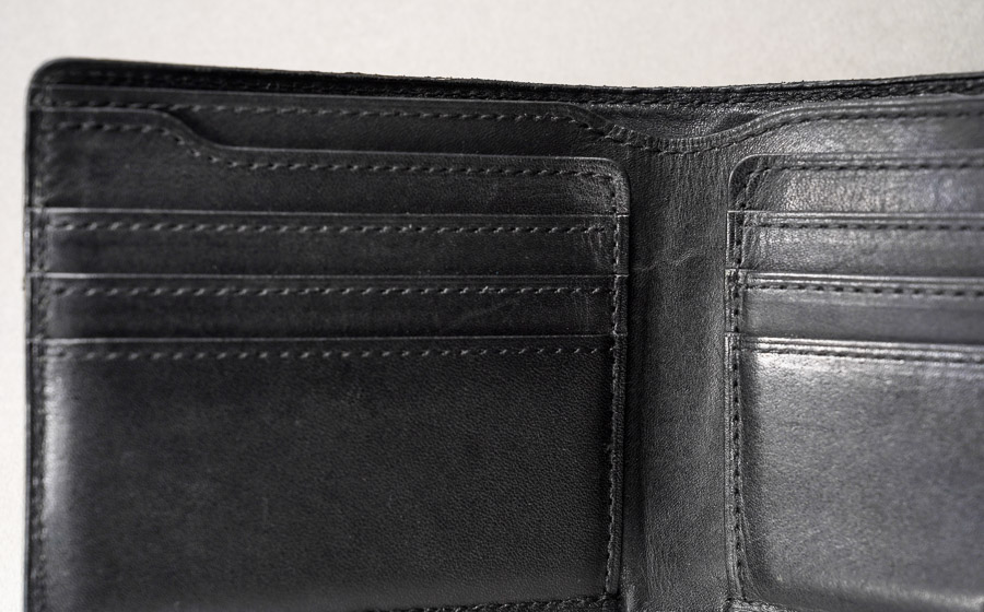 *注意*(こちらの純札入れの形は販売終了で、後継の財布はかなり横幅を削ったため、スキミング対策用のケースに入れたカードは4枚までが収納可能となっております)