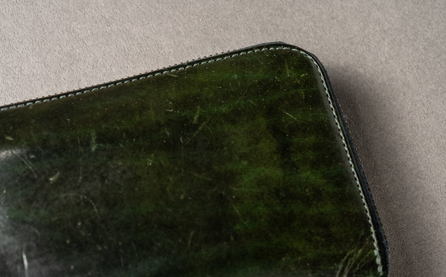A.実はAlt81さんとの出会いは10年くらい前で、当時、海外ブランドの二つ折り財布を使っていたのですが、どうにも容量が合わなくて長財布を探していた時にWebで偶然見つけました。日本製で探していたというのもあるのですが、あの時はネイビーの色味と何か他のブランドとは違う雰囲気がサイトから伝わってきて、好みだったのでネットで買いました。ですが、2年後に紛失してしまい、再度購入したのがこのグリーンです。同じブランドの同じ形を選んだ理由は2年使っていて非常に気に入っていたからなのですが、どうしてもすぐに欲しかったので今度は店舗に直接行って、その場で選ばせてもらいました。ネイビーを買うつもりだったのですが、当時、店舗限定だったこのグリーンに目を奪われ、結果、この色に。偶然ですね。