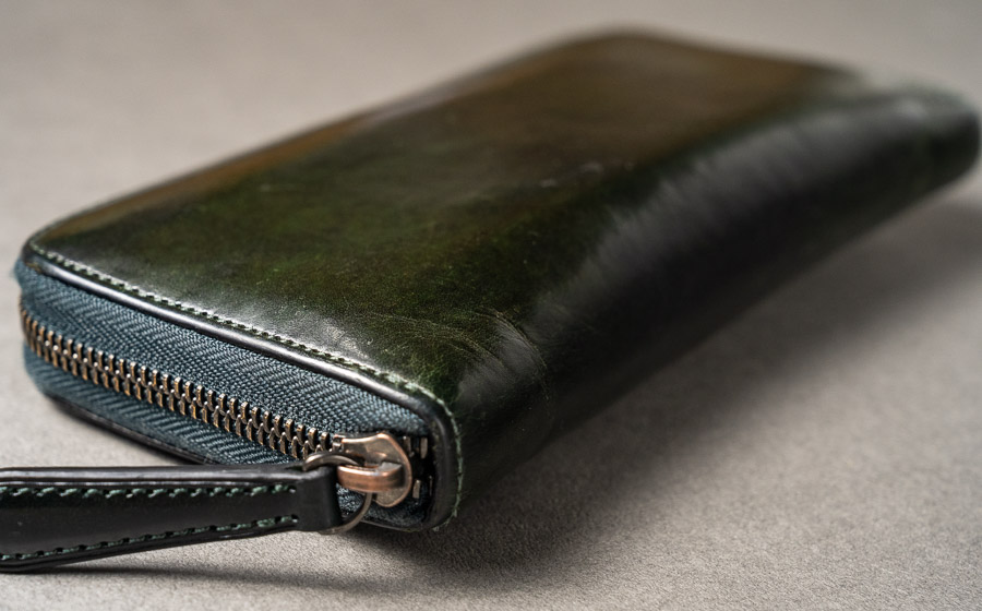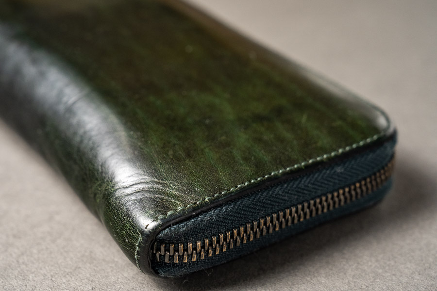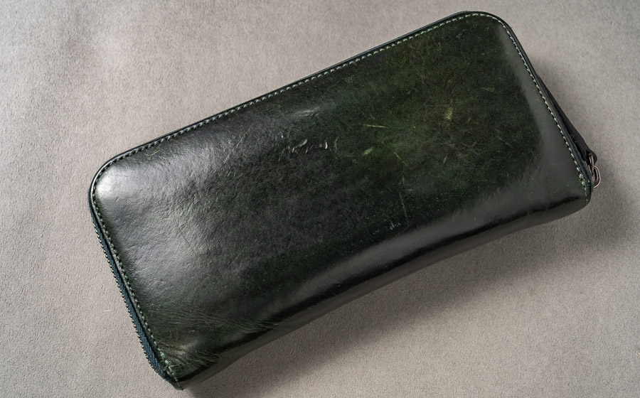 A.普段、バイクに乗ることが多いのでショルダーバッグに入れています。仕事の時もプライベートでも365日ずっと使ってますね。中身ですが、かなりパンパンに入れて使ってます。カードの類が20枚以上あるのと、色々なものを財布に入れてしまっているので。。。メンテナンスは気がついた時にやってます。例えば、水滴が付いた時とか手で触っていてザラザラし始めたりしたらクリームを塗る感じです。多分、頻度としては3〜4ヶ月くらいじゃないかな。今回、外の引き手が切れてしまい、その相談に久々に来店したんですが、やっぱりプロのメンテナンスは違うなぁ、と実感しました。