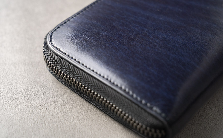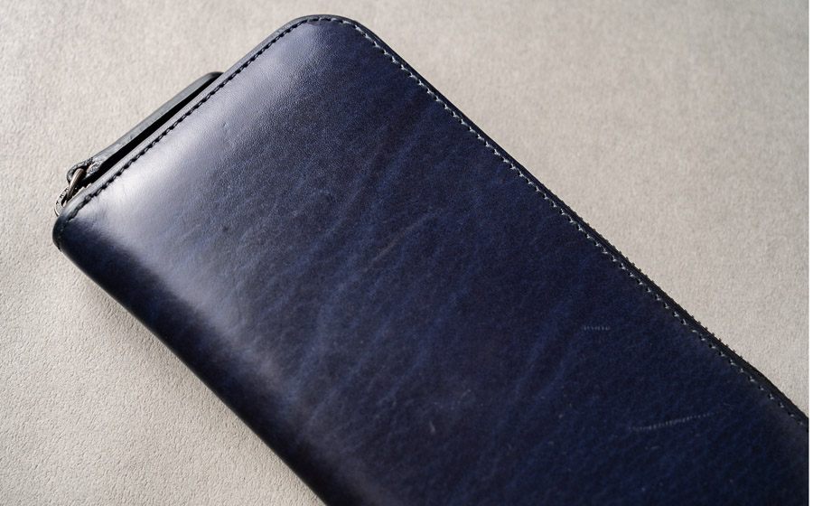 A.数ヶ月に1度の頻度ですが、ノンアルコールのウェットティッシュでサッと拭いて、持っているオイルを長財布の角に少し塗っているだけです。使っているオイルがAlt81で販売しているものと違うので、全体へのオイルメンテナンスは万が一、シミになってしまうと嫌で怖くてしてません。使い方は仕事の時もプライベートの時も鞄の中に入れて持ち歩いています。近所の飲食店に行く時も長財布だけ持っていけばいいかもしれませんが、机の上に置いておいて、何かを溢してしまっては取り返しがつかないと思い、小さなポーチに入れて持っていきます。小銭もカードもあまり入れたくないのでそれぞれ常時、小銭で10枚くらい、カードで6枚くらい、紙幣や領収書関係はその時々によりますが、長財布の容量としては持て余しているくらいです。