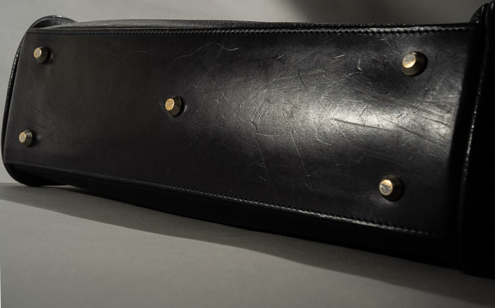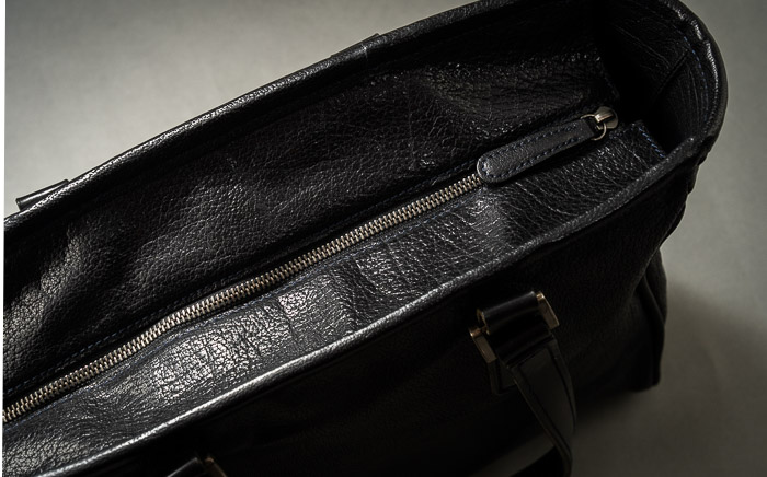 A. 毎日、仕事で使ってます。電車通勤ですが、なるべく下に置かないようにしてます。家に置いておく時も下にはおかずに吊るしてます。中にはそれほど物を詰め込まないようにしていて、中でばらけそうなものは、小物ケースに入れて、それをこの鞄の中に入れてまとめるような使い方です。雨の日も持っていきますが、水滴は気がついたら拭くようにしてます。メンテナンスは、そうだな、今までに2〜3回くらいやったかなぁ。あんまり意識してないけど。