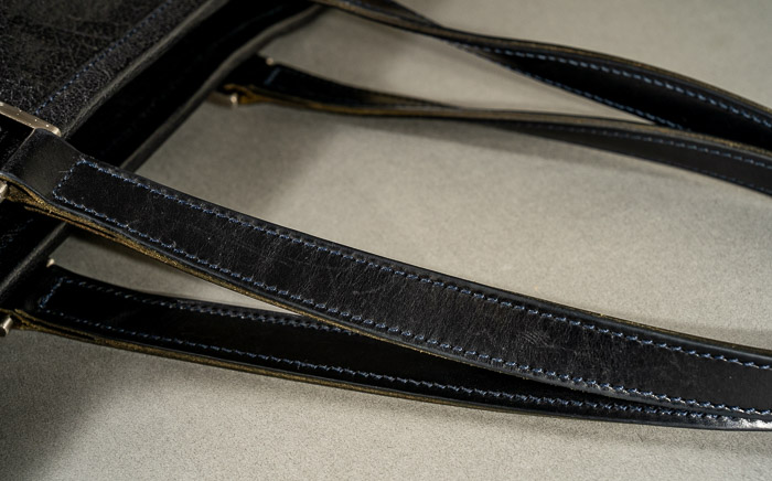A. 肩にかけて持ち運んでいるけど、ハンドルの幅や厚みが肩にかけるのにちょうど良い。それからなんといっても革。このバッファロー革の硬すぎず、柔らかすぎない、独特なコシは触り心地もいいし、最高だよ。このトートバッグが良かったから、その後も同じ革でできた財布とか名刺入れとか買っちゃったくらいだから。
