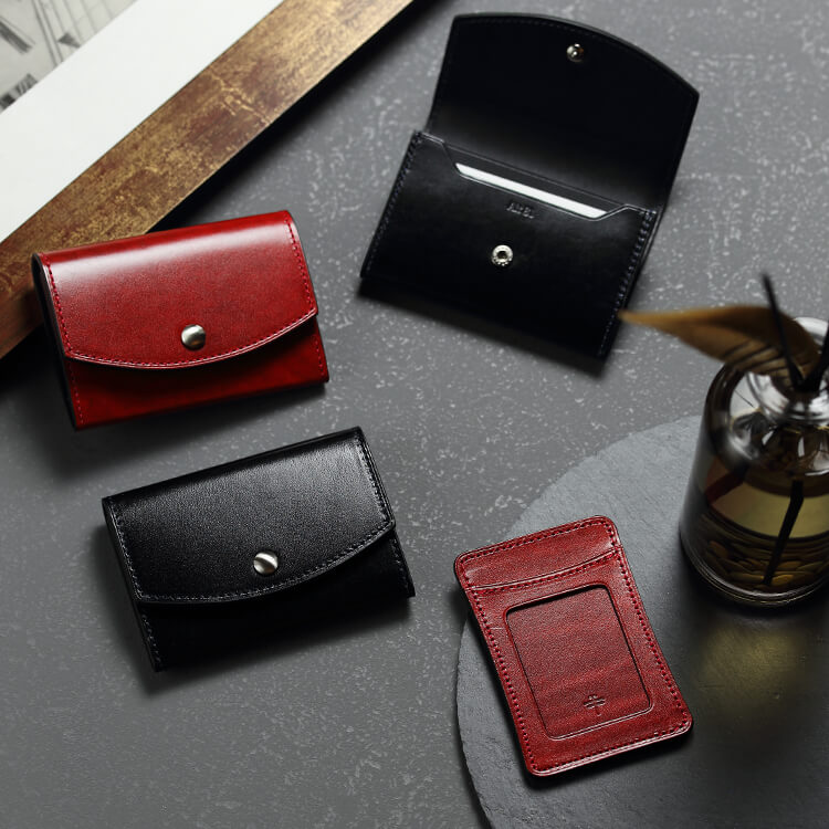 店舗限定色に採用されているレッドとブラックは対照的な空気を持っている。レッドはその鮮やか且つ艶やかな印象で必ず見る人をひきつけ、漆黒ともいえるブラックは硬質で色気があり、吸い込まれるような魅力を持つ。この名刺入れは形も珍しいので、名刺交換をする際には人の脳裏に弥が上にも焼き付く。名刺入れは以前はレッドしかご用意がなかったが、フォーマルの場で映えるブラックへのリクエストが多かったため、満を持して登場。ということは、パスケースに関してもご要望が多ければ、ブラックが誕生する日がくるかもしれない。