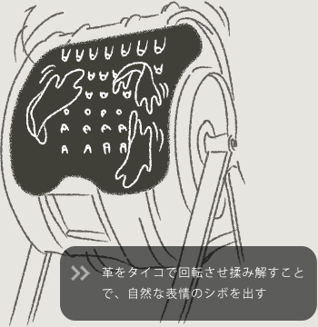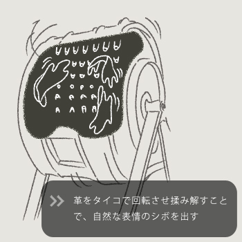 さらにカーフ独特の肌目の細かい自然な表情を出すためにあえてシュリンク剤(表面の凹凸を無理やり出す薬品)を使わずに革を空のタイコに入れて回転させ、揉み解してシボを出す工程を行っている。(※右図)そのため、人工的に出されたシボとは違い、カーフが本来持つ繊細で美しい自然な肌目が銀面に現れ、場所によって表情の異なる非常に魅力的な革になるというわけだ。