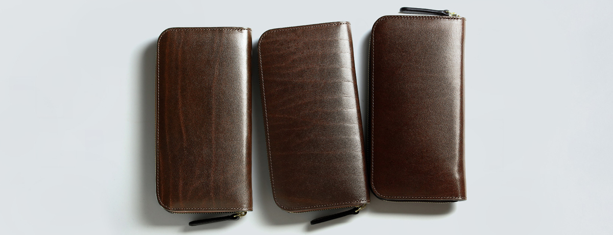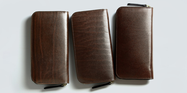 この革の経年変化は少し独特だ。最初から非常に高い艶があるため、「使い続けると艶々になる」といった通常の変化がない。だが、だからといって変化しないわけではないところがルガトショルダーの面白いところ。革が非常に硬質で初めから艶があるため、傷が入ると少し目立ちやすいが、とにかく気にせずに使い続けて欲しい。ある程度、使い込むと表面の艶が落ちつき、一度マットな質感になる。そしてそこから、革本来の艶が再び上がっていくというとても不思議な経年変化が起きる。この変化は長年使い続けていかないと味わえないもので、ルガトショルダーならではの面白さ。色によっても経年変化後の発色は当然異なるが概ね、濃くなっていく傾向がある。そのあたりはお客様の使い込んだ商品を撮影させていただいた「使ったからわかること」を参考にしていただきたいが、これもあくまで一例だということもお忘れなく。