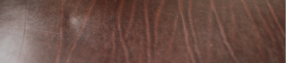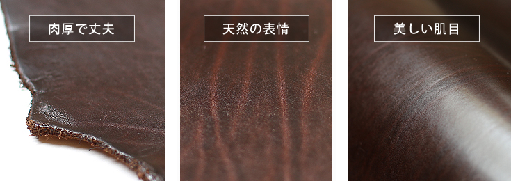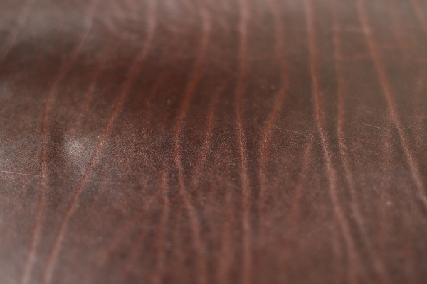 1つ目は繊維密度が高く、肉厚で丈夫な革質であること。太さの揃った繊維束同士がよく絡み合い、さらにその間に細かい繊維束が混じっており硬く逞しい感触が得られる。2つ目は革に出る模様。ショルダー特有のトラ(首や肩にある太いシワ)が多く見られ天然の革らしい表情が愉しめる。3つ目はパンと張った美しい銀面(革の表面)。ルガトショルダーはこれらショルダーならではの長所を存分に堪能できる革として親しまれている。