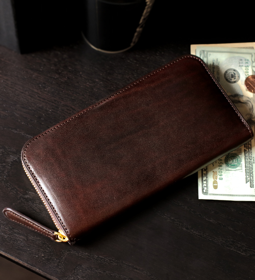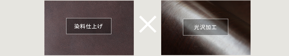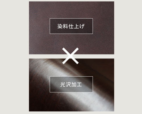 この革を製革する上で特徴的とも言える工程が、染料仕上げ。染料を使用して染めることで革全体に濃淡のある色ムラが生まれ、この色ムラが革が本来持つ天然の表情をより引き立てる。また、艶加工も独特だ。見た目の印象に大きく影響を与えているこの艶は水性光沢剤で熱を利用して施したもの。染料と光沢、それぞれが相互に引き立たせ合ってはじめて独特の透明感と深みのある革色を生んでいる。当然、この染色に使用される染料をはじめとする薬品関係もこの革独自のもので一切が企業秘密となっているため、同様の革を作ろうとしても不可能。ルガトショルダーの艶麗な光沢がもたらす革の奥行を存分にお愉しみいただきたい。