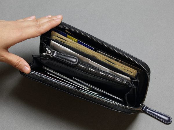 A. とにかくレシート、カードと持ち物が多いので、このお財布は札入れポケットが3つもあり、背面ポケットは2つもあるので色々収納できて便利ですね。