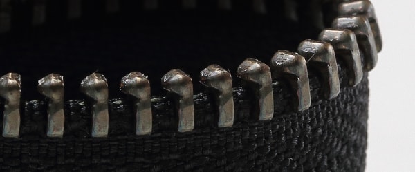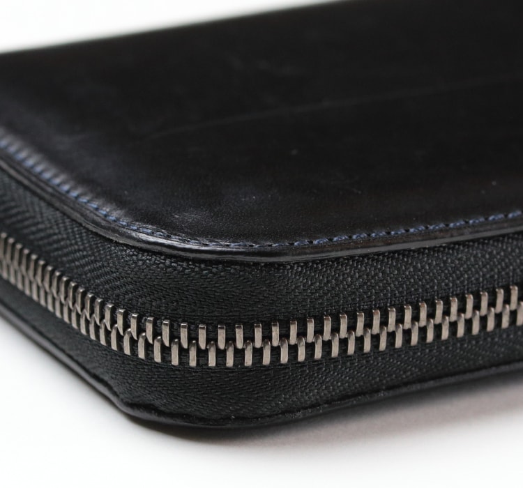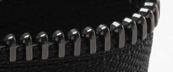 ラウンド長財布になくてはならないファスナー。ファスナーには様々なサイズがありますが一般的にラウンド長財布に使われているのは「3番」というサイズです。3番のファスナーは務歯(噛み合う部分)が小さいため滑りがよく、小物や財布などに利用されるケースが多いのですが、引っ張る力が強くかかるとトラブルを起こすことが稀にあります。ひょっとすると務歯の噛みが悪くなり「パカッ」と真ん中で開いてしまうファスナーや、使い続けるうちに上手く噛み合わなくなるファスナーを見たことがある方もいらっしゃるかもしれません。長財布は毎日、何度も使いますし、収納力があるので中を膨らませてファスナーに負担をかけてしまいがちです。そういったことが原因で壊れて修理に持ち込まれるラウンド長財布が多いという話を職人から聞いた私たちは、高い強度を持っている5番のファスナーを採用しました。