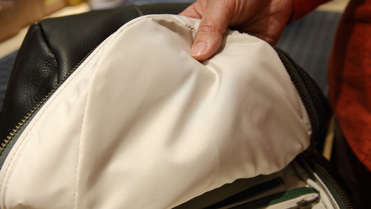 猪瀬:よくそんなところ見てるね(笑)。でも、めちゃくちゃ鋭い。実はこのナイロン、「高密度ポリエステル」っていう医療用にも使われるような生地 なんだ。一般的な革製品に使われているものより1本1本の糸が細くて、その糸の構成数が多い。だからタッチ感は滑らかで全体的にドレープ感がでる。糸を高密度に織り上げるから肉厚の割にモチっとした質感もでる。しかもデュポンのテフロン加工も表面に行っているから耐久性の高い撥水性能もある。だから汚れもつきにくい。本来は鞄の内装に使う生地じゃなくて、服に使うみたい。