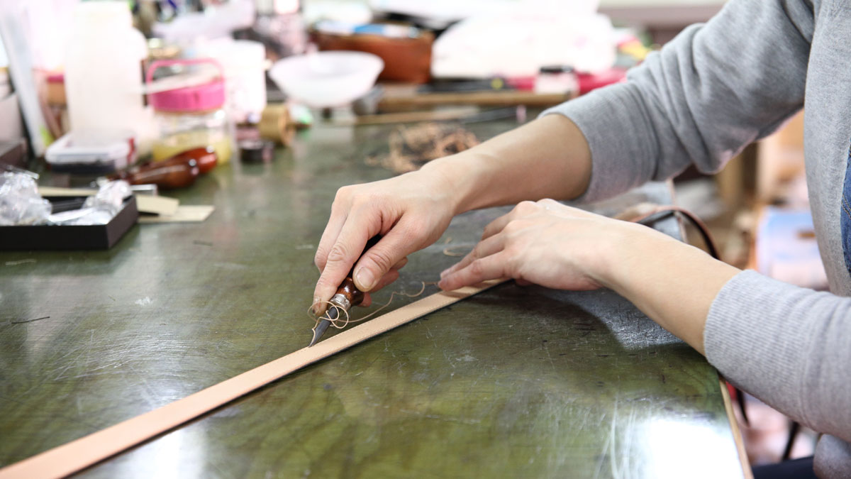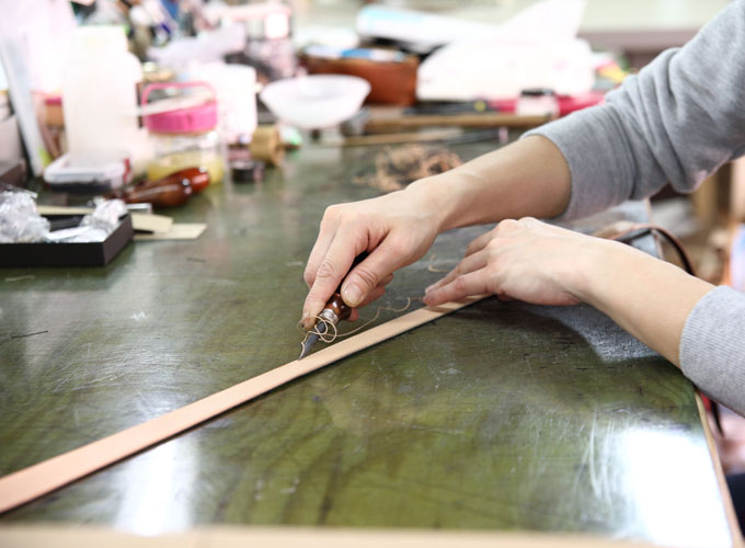 部分漉き:裁断を行ったパーツの一部を漉くこと。型紙を元に裁断を行った後にはその後の工程の為に必ずこの作業を行う。昨今、数を作る場合は「パーツのどの部分をどれくらい漉くか」というのは事前に決まっているので漉きを専門で行う職人に依頼をする。