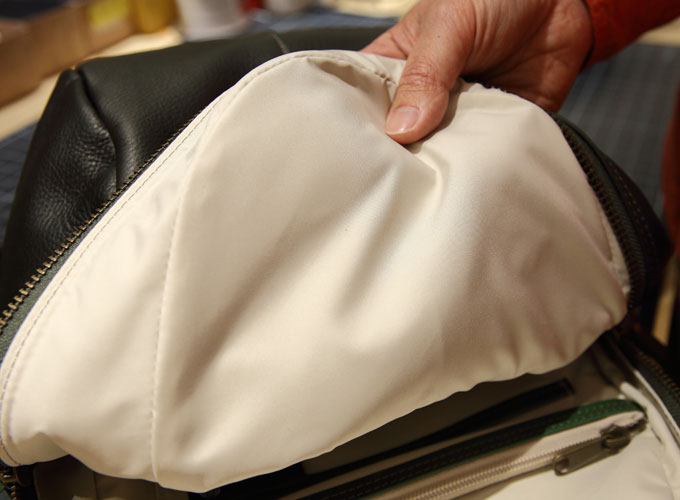 猪瀬:誰でも作れるわけじゃない。立体裁断は職人の勘、感覚が頼りな部分が多々あって、例えば革のコンディションによって革の漉き加減や撚り加減も違うから常に一定のやり方じゃできない。だから、その都度加減を変えていく。縫ってて革が余りそうならこの長さの中でミシンの送り方なんかを調整して縫わないと形が崩れちゃったりする。立体裁断の一番難しいところは、この普通に縫っているだけじゃ上手くいかない部分だね。革を寄せながら送り方もこの加減は本当に職人の勘だと思うよ。ちなみにこのリュック、量産する際もパーツの部分漉きは職人自身がやってるよ。
