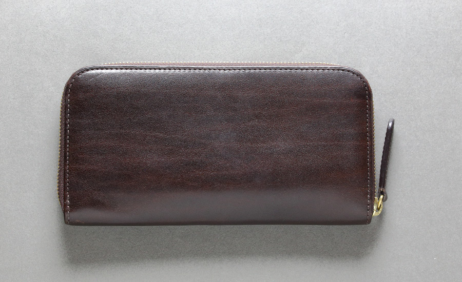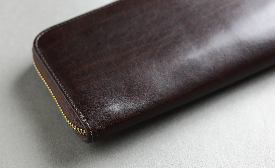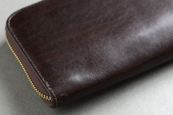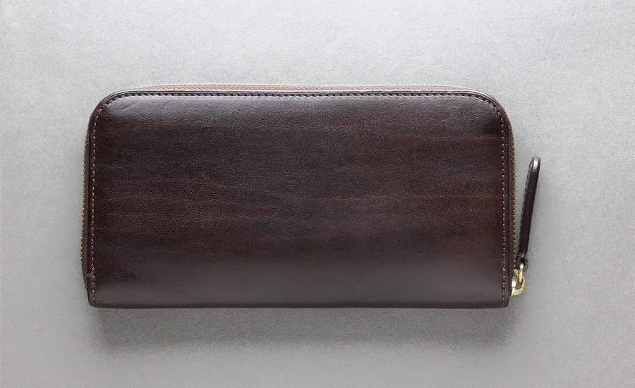 A. メンテナンスは何もしてません。今回、財布を撮影してもらうにあたって、メンテナンスオイルを塗ったほうがいいと言われて撮影前にお願いしているのが最初です。使い方はずっと尻ポケットに入れていて、バイクに乗る時だけ鞄の中に入れてます。鞄に入れるときは一応、先の尖ったものと一緒に入れないように気を付けてました。雑に扱っててすいません。