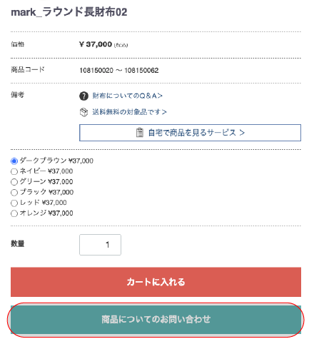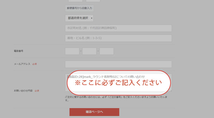 「お名前」・「郵便番号」・「住所」・「電話番号」・「メールアドレス」を記入し、「お問い合わせ内容」の欄にあらかじめ記載されている商品名の下に「自宅で商品を見るサービス希望」(※下図参照)とご記入ください。その後「確認ページへ」をクリックし、送信を完了してください。