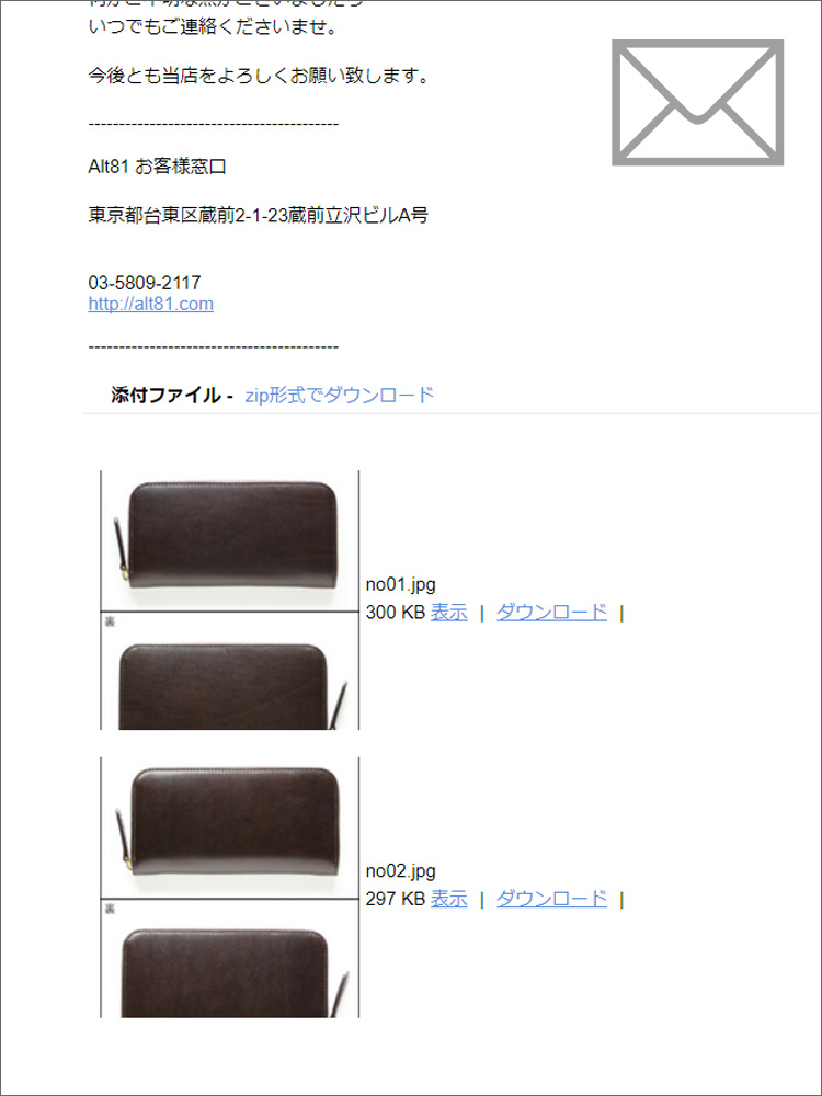購入手続きの翌日から翌々日にはご注文の際に記入していただいたメールアドレス宛てに写真をお送りしますのでご確認ください。お客様の環境によっては画像が見れないこともございますのでその際はお手数ですがご一報ください。