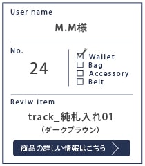A. 革の質感と今の艶です。インターネットで財布を購入するのは初めてでサイトにも色々と書かれていたのでなんとなくのイメージはできるのですが、やはり触ってみないとわからない。わなからないこともあって、電話をしたら商品サンプルを送ってくれるって言われたのですが、逆に申し訳ない気持ちになっちゃって。そこまで自信があるなら、と勢いで買ってしまいました。届いたときの質感が自分が知っている革の質感とは違っていて、硬くてパサッとしていて吃驚しました。そして使い込むことでしっとり艶々になってきて、この変化は流石の一言に尽きます。