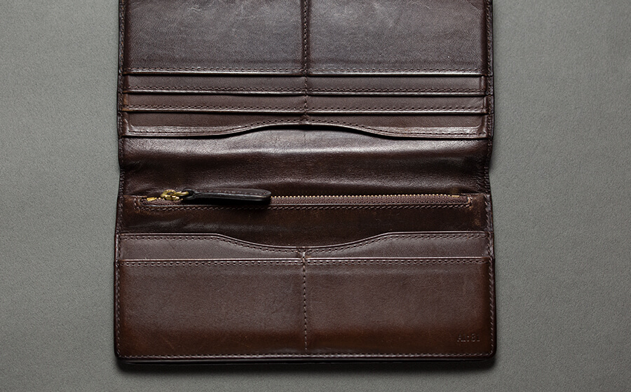 A. たしか財布を探していた時に見たWeb広告がきっかけで、店舗に来たと思います。これの前は二つ折り財布を使ってましたが、容量オーバーで凄く厚くなってしまい長財布の方がいいと思って探してたんですが、百貨店やセレクトショップを回ってみたけれど、なかなかピンと来くるものがなく。こちらの店舗で実物に触れた時に「これだ」と思いました。