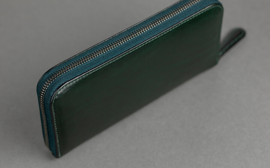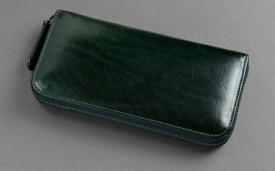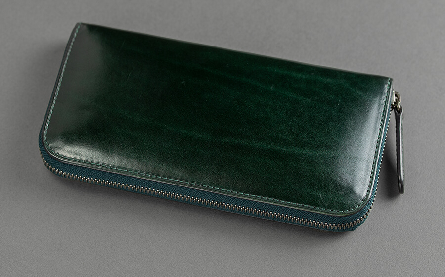 A. 以前も同じようなラウンド長財布を使っていて、やっぱりラウンド長財布が良いと思い、ネットで探していて見つけました。革の模様や質感について、サイトに結構しっかりと書いてあったので実際に見てみたくなり、直接、蔵前のお店に行って在庫の中から要望を言って出してもらい、悩みながら選びました。最初に見せてもらった時には一つ一つの違いに驚きましたが、横に模様の入ったものに惹かれて2点まで絞り込んで。結構悩みましたね。