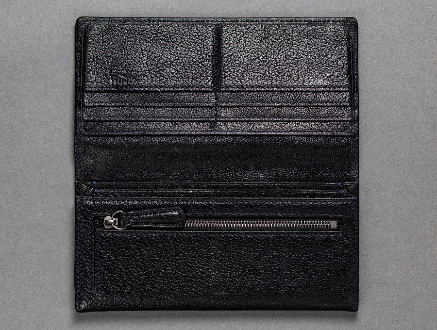 A. 蔵前エリアを散歩していたら、偶然お店を見つけて。何だか素敵な雰囲気だったので入ってみました。見るだけ…と思っていたんですが、気付いたら購入していましたね。シボの粗いもの、細かいもの、傷跡や虫に刺された跡、お話を伺いながら見せて頂いた長財布は、同じデザインでも全く違う表情をしていて、心奪われました。細部にこだわりが詰まったデザインと機能性に丁寧な仕事ぶりが見て取れて、とても魅力的でした。
