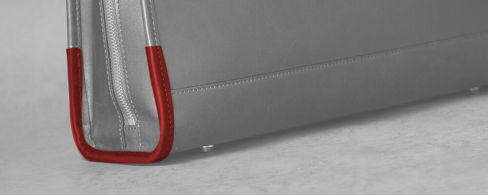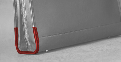使い続けるとどうしても傷みやすい箇所が出てくる。Alt81は安心して長く使えるようにあらかじめ使用中に起こりうる事例を考慮し、念入りな補強を施している。鞄の胴版を囲っているヘリ巻き(革で包み込む)の作りもそのためのものだが、特に当たって傷み易い下マチ部分にはヘリ巻きの上からさらにヘリ巻きをかぶせている。万が一、革が擦り減ったり削れた場合には革のパーツを交換出来る仕様にした(※下図・赤)。鞄の側面というのは正面で向き合った時に意外と相手に見られている箇所。カチッとした印象を与えるtrack_ブリーフケース01だからこそ一層意識して設計と作りに工夫を重ねた点だ。