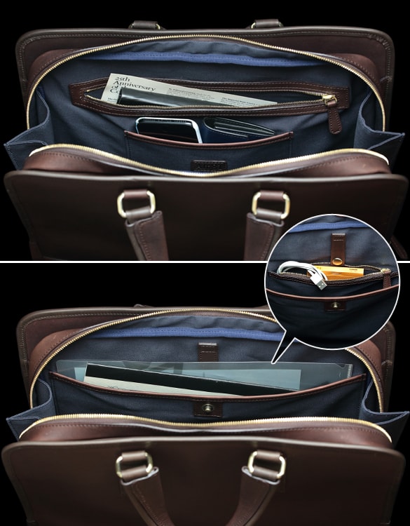 「もしも」に備えた資料を用意する堅実な人にとって欠かせないのは荷物の収納力だが、このブリーフケースなら心配は無用だ。まず、マチが広いために書類やファイルがたっぷりと入る(容量比較コンテンツはこちら)。そして内装にはサイズや形の異なるポケットを前胴・背胴合わせて4つ装備。大切な書類や散らばりやすい小物を分けて収納できる。さらに細やかな使用感にも配慮。前胴側のホック付ポケットの中にファスナーポケットが配置されているが実は鞄から中身を出し入れする際に手があたらないよう、あえて中に隠している。使わない場合にも邪魔にならない点も嬉しい。こうした小さな作りの差が使い手のストレスを軽減してくれる。