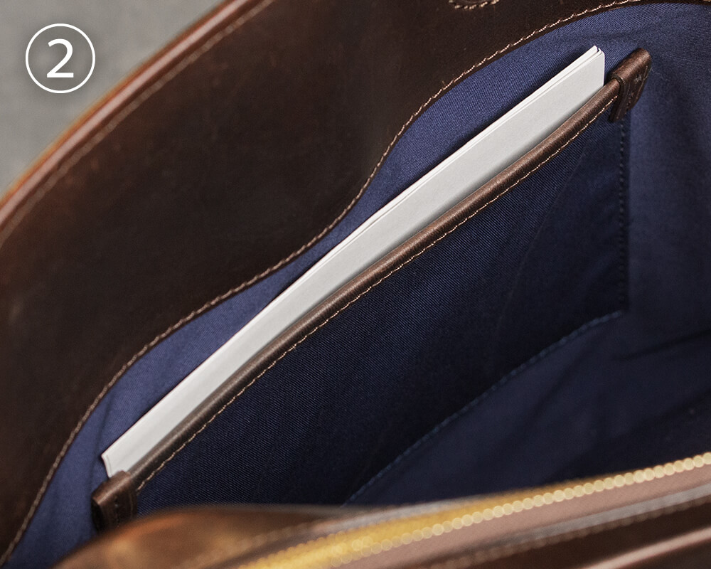 このブリーフケースにはファスナー開閉式の収納部の前後に2つのアオリポケットが備わっている。これが実に機能的だ。留め具には隠しマグネット(革でマグネットを覆う)方式を採用しているため、スッキリとした見た目で、物を出し入れする際に留め具がひっかかることもない。また、ファスナーを開けることなく出し入れができるので、新聞や雑誌、定期など出し入れの頻度が高いものを入れておくと非常に便利。さらに背胴側のアオリポケット内部にはペン挿し(①)とフリーポケット(②)も搭載。このアオリポケットを使えば、外ではほとんど鞄を開けることなく、恐ろしくスムーズに物の出し入れができるはずだ。
