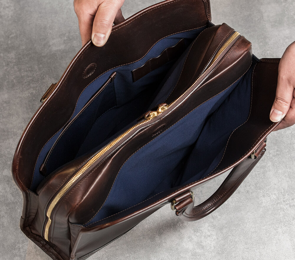 track_ブリーフケース01のファスナーは底面まで全開にすることができるので鞄の中を探しやすい。内装の色は長く使っていると気になる汚れを目立たなくさせるため、ダークブラウンには紺を、藍鉄には茶を採用。またファスナーを全開にしても、蛇腹状のササマチに高さがあるために中のものが側面から見えることがない。さらにファスナーを開けていても鞄が自立してくれる作りも容量がある鞄として使い勝手の良さを実感できる部分だろう。
