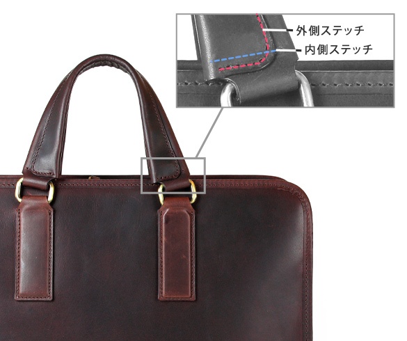 ハンドルは形と同時に荷物の重みに耐えられる強度と耐久性も求められる。Alt81はハンドルと接続する金具の角カン部分に強度が増すよう内側と外側の両方からステッチを施した。作業の手間は増えるが重みの負荷がかかりやすい箇所だからこそあらかじめ入れた工夫である。また、ハンドルには伸び止めを入れ革の伸びを防ぎ、さらに根革(ハンドルを鞄の本体に取り付ける革部分)にも伸び止めを入れるひと手間を加え補強している。手で握るたびに感じる快適な使用感は取引先へ向かう背中を後押ししてくれるだろう。