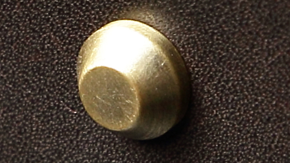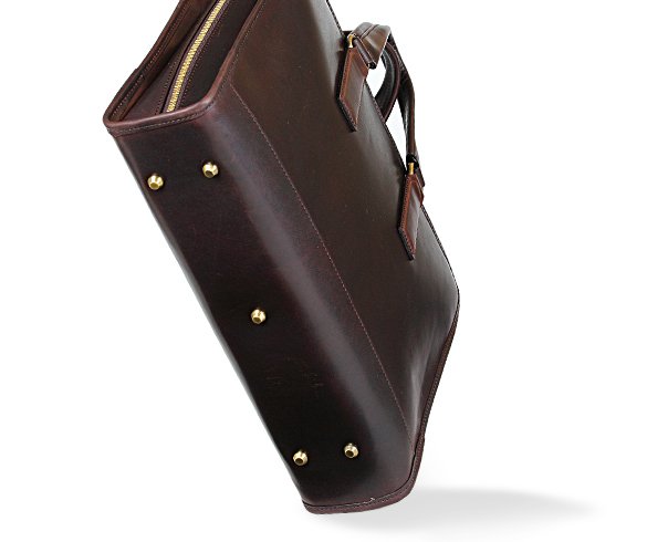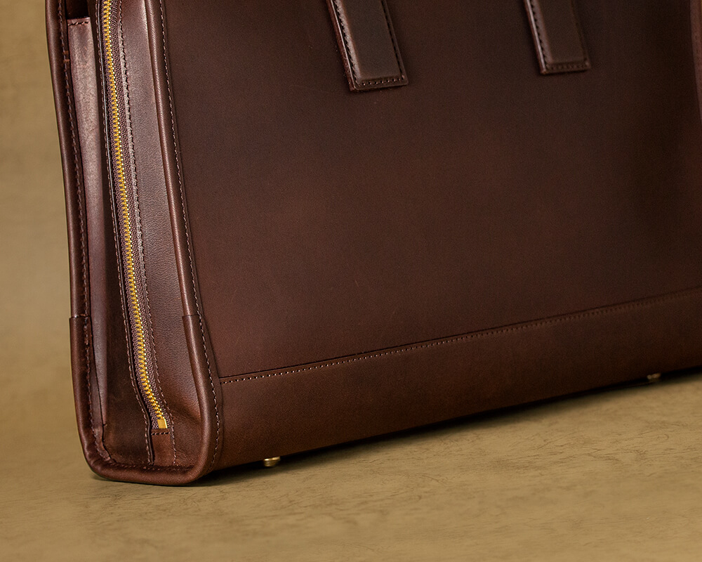 直接地面に置く底面には重厚感が漂う真鍮削り出しの金具を使用。鞄を直接、地面に置くよりも革の傷みは和らぐのは勿論のこと、鞄を地面に置いた時の「カツッ」と鳴る音が気持ちがよく、高級感が漂う。普段使っている際には見えない部分だが、あるのとないのとでは大きな差が出る箇所。そこに真鍮削り出しの挽物を使っていることはちょっとした自信に繋がるだろう。
