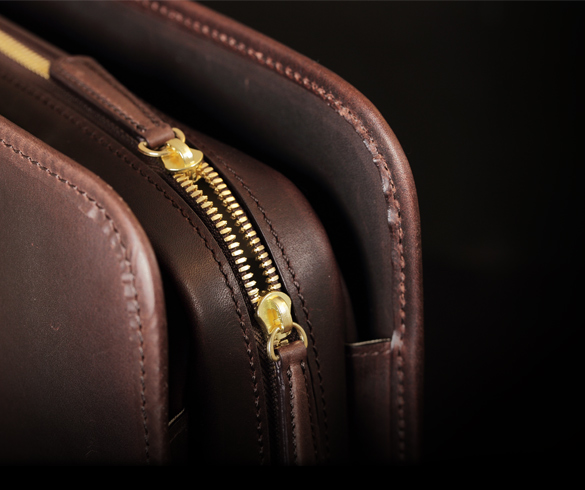 使用頻度の高いファスナーには壊れ難い頑丈さとスムーズな使用感を求めたい。そこで噛み合うひとつひとつの金具「務歯(むし)」の両面を削るひと手間が入ったエクセラファスナーを使用し、通常よりも圧倒的によい滑りを実現させ、開閉のストレスを無くした。また、がっちりと密度の高い噛み合った務歯が重厚感と高級感を醸し出し、革色にマッチしたファスナーの色は見た目にも美しい。スムーズに動くファスナーは負荷がかかりづらく、また壊れ難さにも繋がっている。