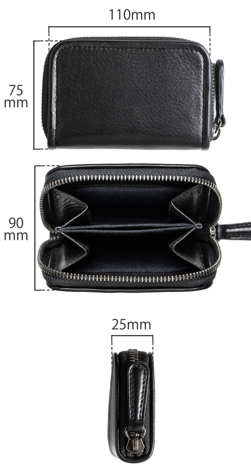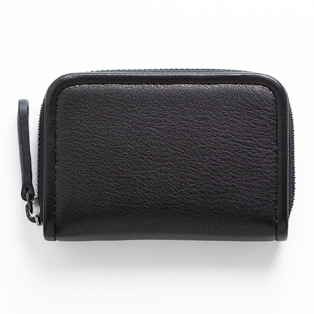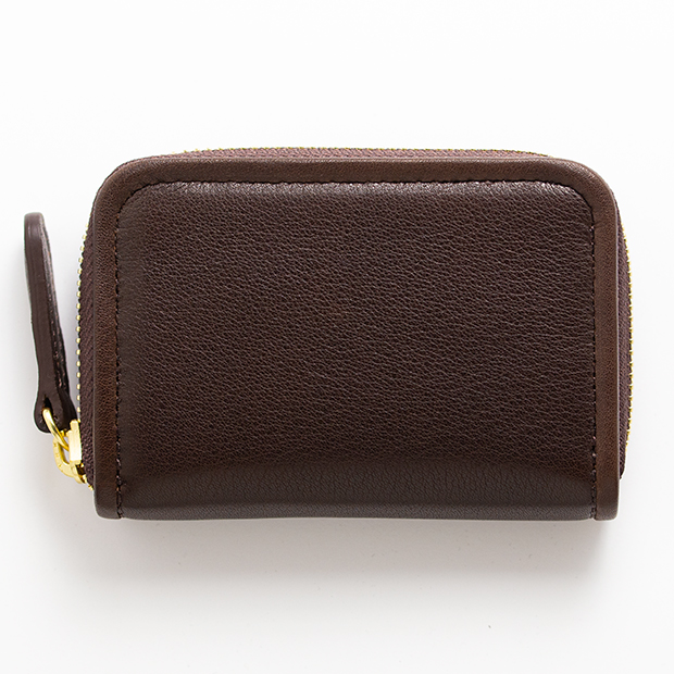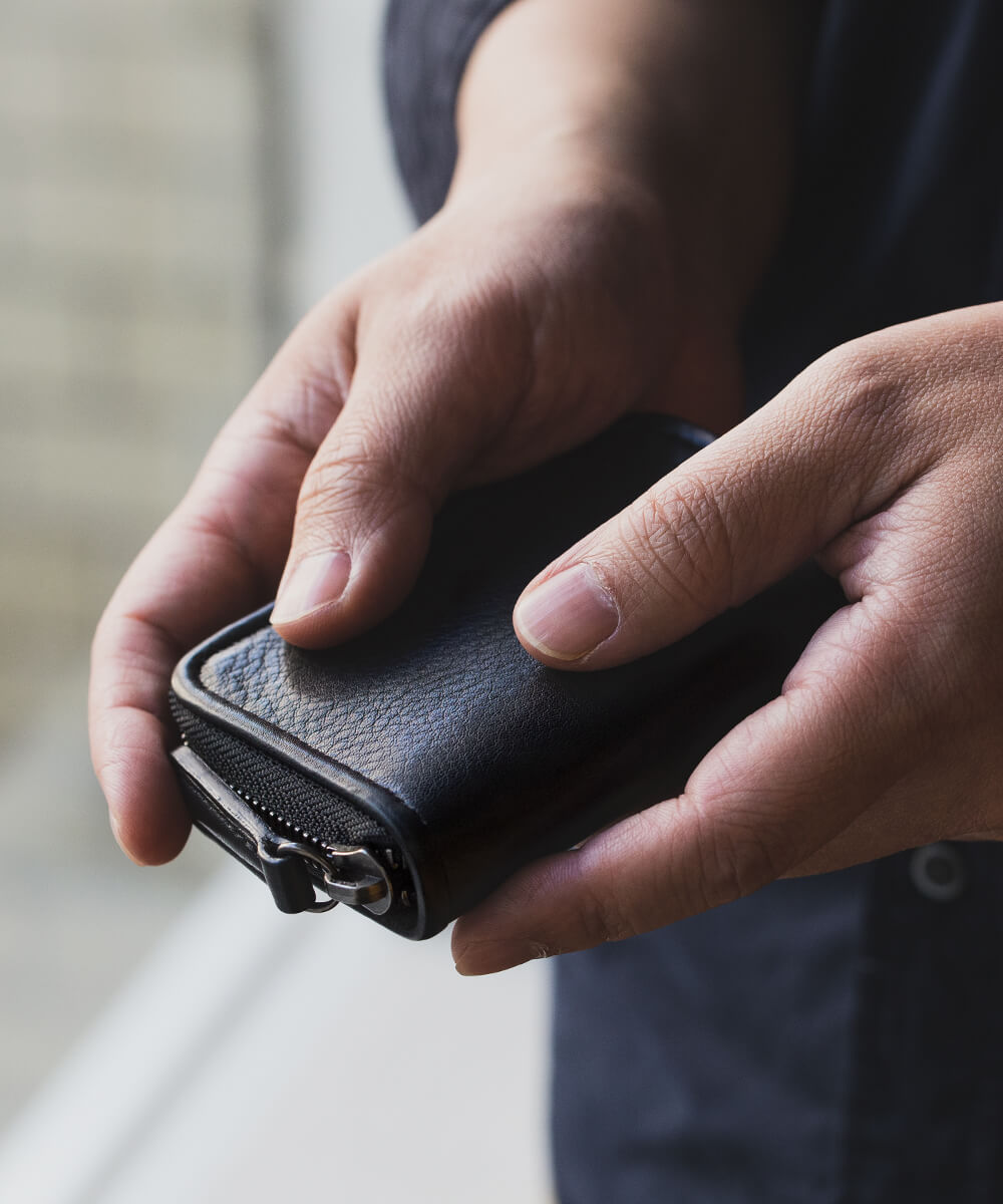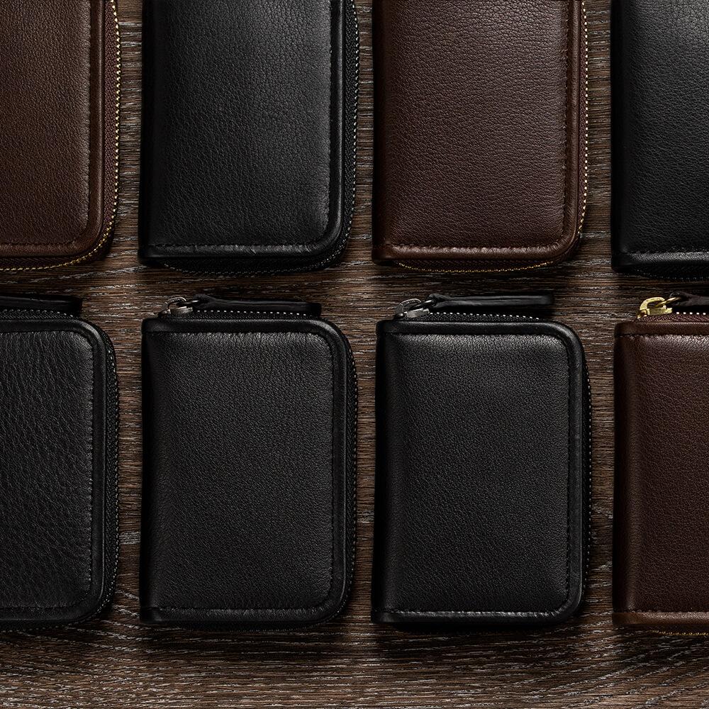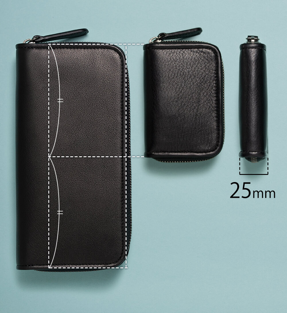 大きさはpage_ラウンド長財布01と比べると縦横比で約1/2。小さすぎることも、大きすぎることもない絶妙なサイズ感だが厚みは25mmあり、薄くはなく存在感がある。page_ミニラウンドホルダー01の大きさのポイントは「握りやすく革質を感じ取りやすい」だ。そもそも薄く作ると容量がなくなり、たっぷり入れようものなら、革が伸びてしまう。しっかりと厚みを持たせたことで容量がたっぷりと、またこの革特有の質感も損なわない仕様にすることができた。大事なものを入れた時もコの字のファスナーであれば勝手に開くこともなく、安心感も一入だ。