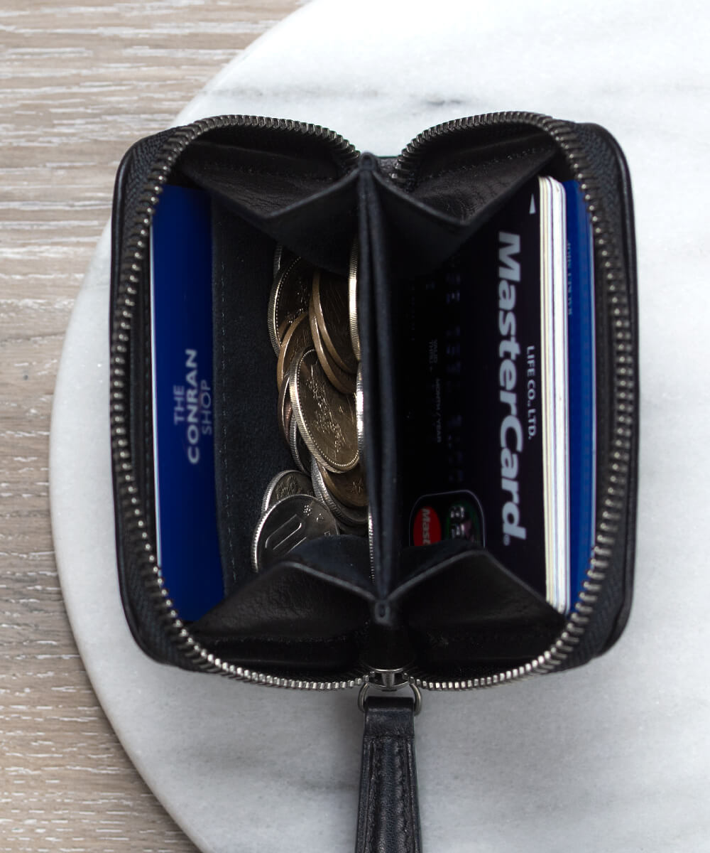 しっかりとした厚みを持たせたミニラウンドタイプだが実際どのくらいの容量があるのか?人によっても許容の範囲は異なると思うが、プラスチックのカード(クレジットカードや免許証などの大きさ)で私たちの感覚で14枚が収納可能。両背面にそれぞれ1枚ずつカードを差し込めるカード段があり、そこに沿わせるようにカードを収納していく方法で、両面に合計7枚ずつで合計14枚という計算だ。勿論、14枚もカードを持っていない人は片面に7枚カードを収納し、もう片面に小銭を収納すると優に20枚は入れることができる。使う人に合わせて入れるものを調整することで様々な組み合わせが可能なので、万人に受け入れられやすい製品に仕上がっている。