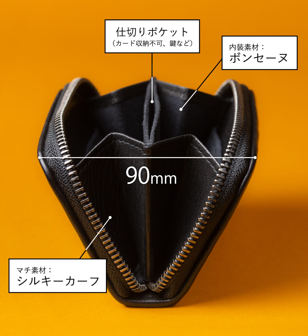かなりの容量があるこの商品、マチがたっぷりと取られているので非常に開きが良い。最大で90mmほど開くことができ、見渡しやすく取り出しやすい構造だ。そのマチは外側を表革と同様のシルキーカーフ、内側を起毛の生地であるボンセーヌを採用していて耐久性も高い。また、背面のカード段は一般的なカード段に比べると浅くなっていて、取り出しやすくなっている。製品の中心にある仕切りはベタマチの収納ポケットになっていて、カードを入れることはできないが、鍵やちょっとしたものであれば分けて入れることができる。