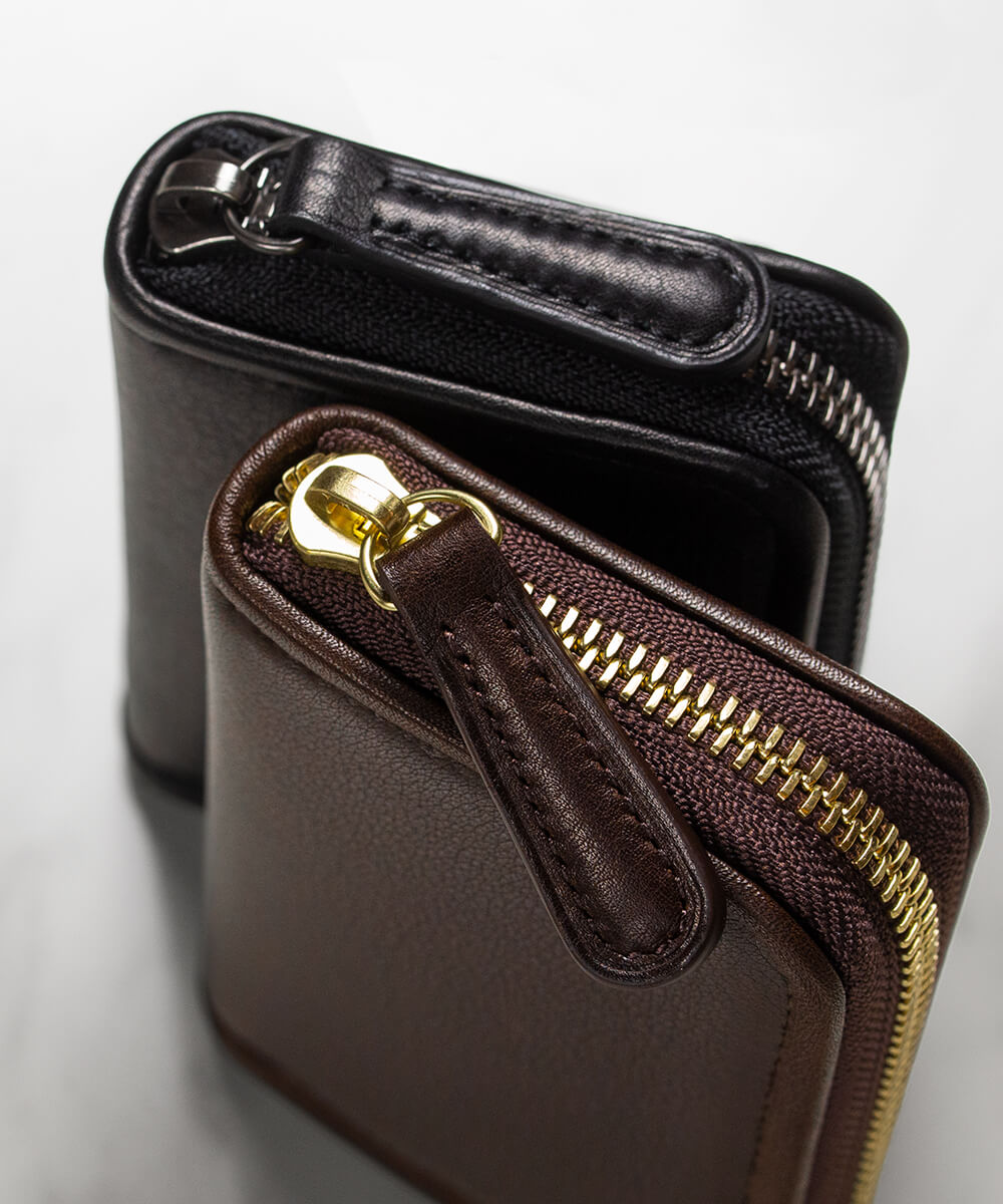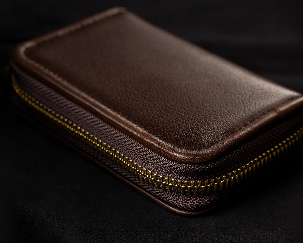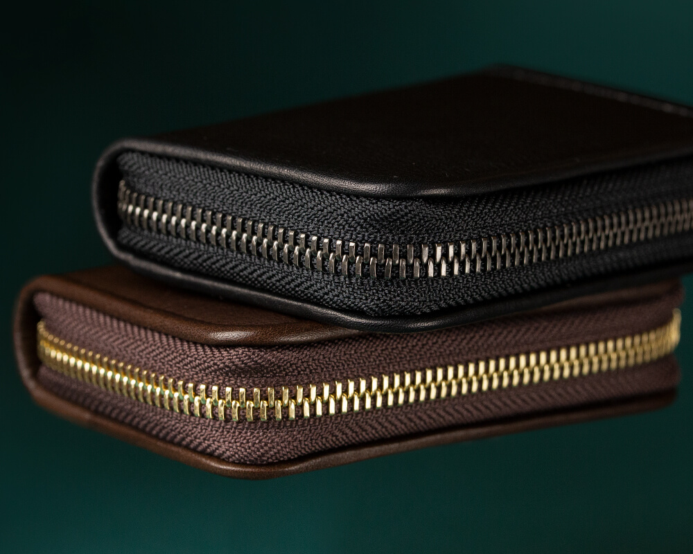 通常、コンパクトな商品に使われるファスナーは務歯(ファスナーの金属部分)が小さなもの(主に3番ファスナーと呼ばれるもの)が使われることが多い。だが、このpage_ミニラウンドホルダー01に採用されているファスナーは小ぶりな商品では珍しい務歯の大きな5番のファスナーが採用されている。その訳は丈夫さと厚みとの比率。3番ファスナーは繊細故に滑りやすいが丈夫さを比較すると5番ファスナーに軍配が上がる。さらにファスナー自体がYKK社製エクセラファスナーという金属の務歯を1つ1つ磨いた滑りの良い最上級のものを採用しているため、滑りが良い。また、全体のバランスも製品自体に厚みがあるため、5番のファスナーでも違和感がない。計算ずくの採用というわけだ。