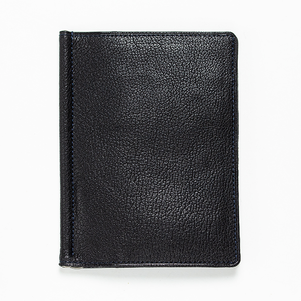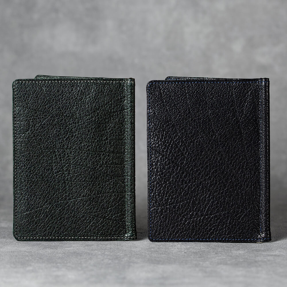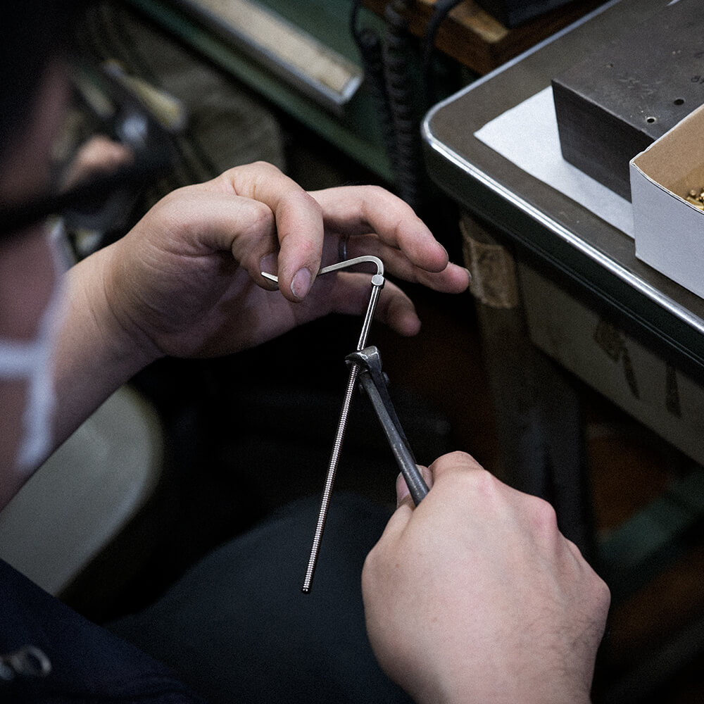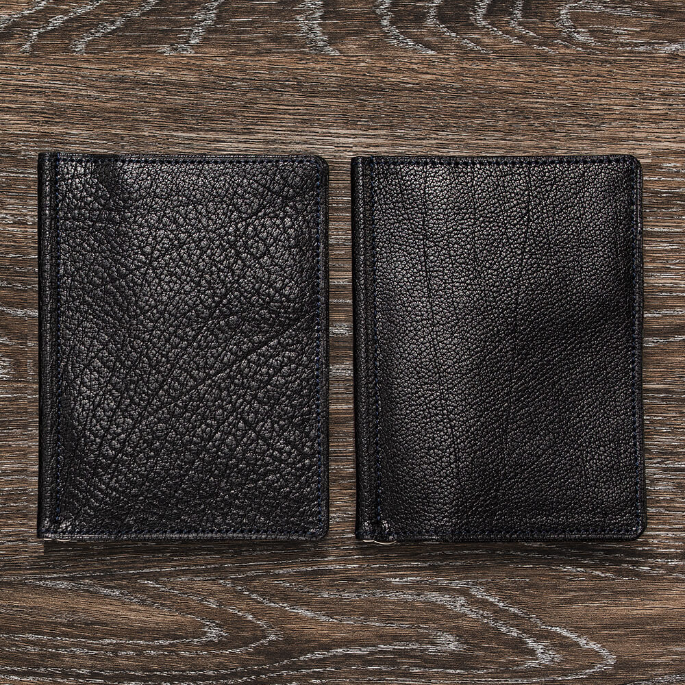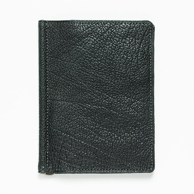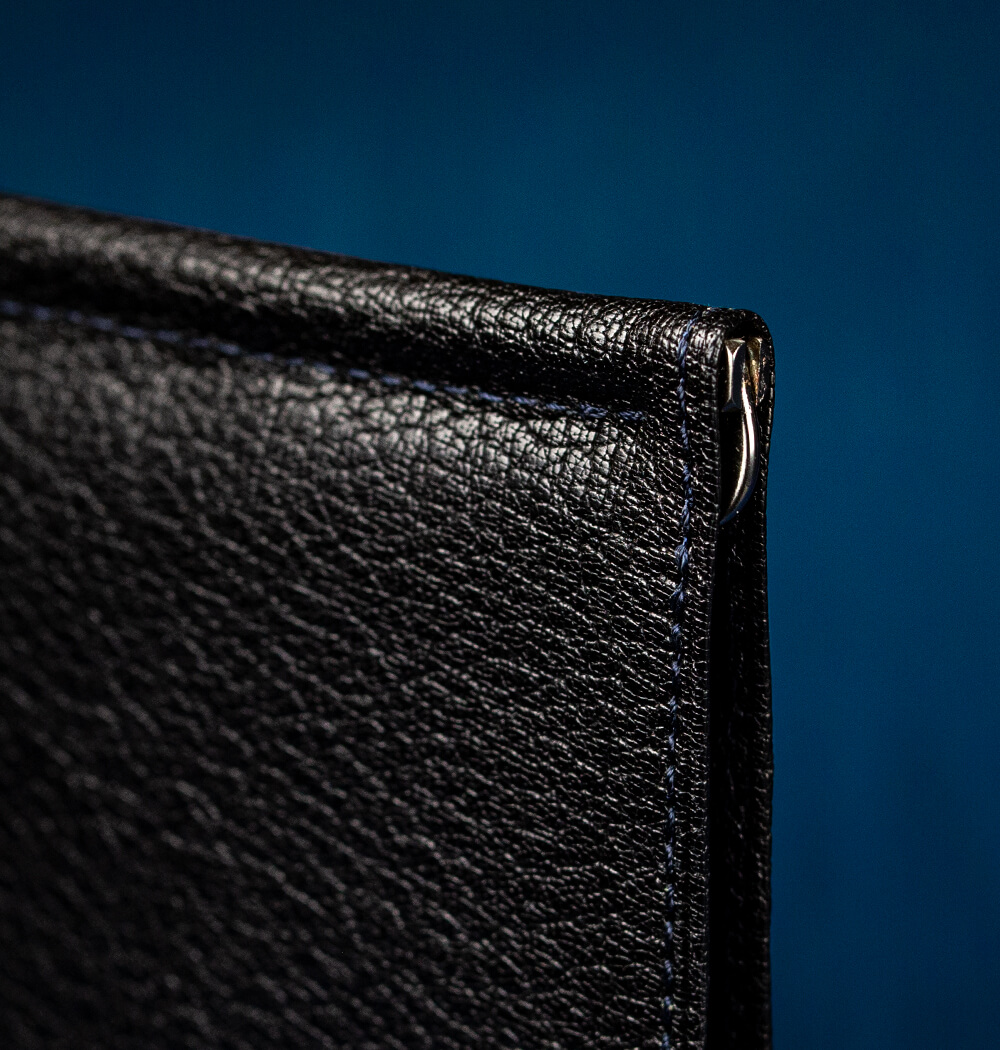 前述のとおり、縦長のマネークリップの金具は稀有。ゆえにオリジナルのものを作ってもらうことになる。本体が縦長なために金具の軸となるバネが通常のものよりも40mmほど長くできており、それに伴い製造にも細かい調整が必要となる。また、金具には黒ニッケルサテー加工が施されており、大人の魅力を際立たせている。実はマネークリップの金具は革製品に使われる金具の中でも多くの工程を経て完成する珍しい部品で、それゆえに金具の調整は全て金具の職人でなければならない。非常に専門的な部品なのだ。