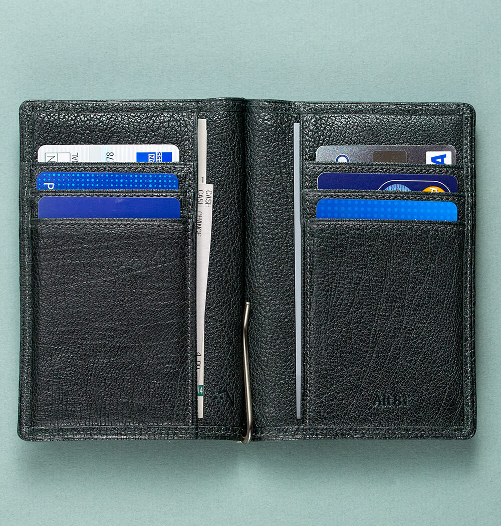 このフォルムを見てマネークリップだと気が付く人は少ない。革製品に詳しい人であればまず首を傾げるだろう。なぜならマネークリップは紙幣に合わせてカードも横にして収納するため、横長の製品が多い。また、そのためにマネークリップの金具は横長用のものしか存在しない。だが、このarrow_マネークリップ01はより収納力や利便性を高めるため縦長を目指した。スッと縦に長い財布の形状はジャケットの内ポケットへの収まりも良い。そんな常識を少しだけ破ったマネークリップをご紹介しよう。