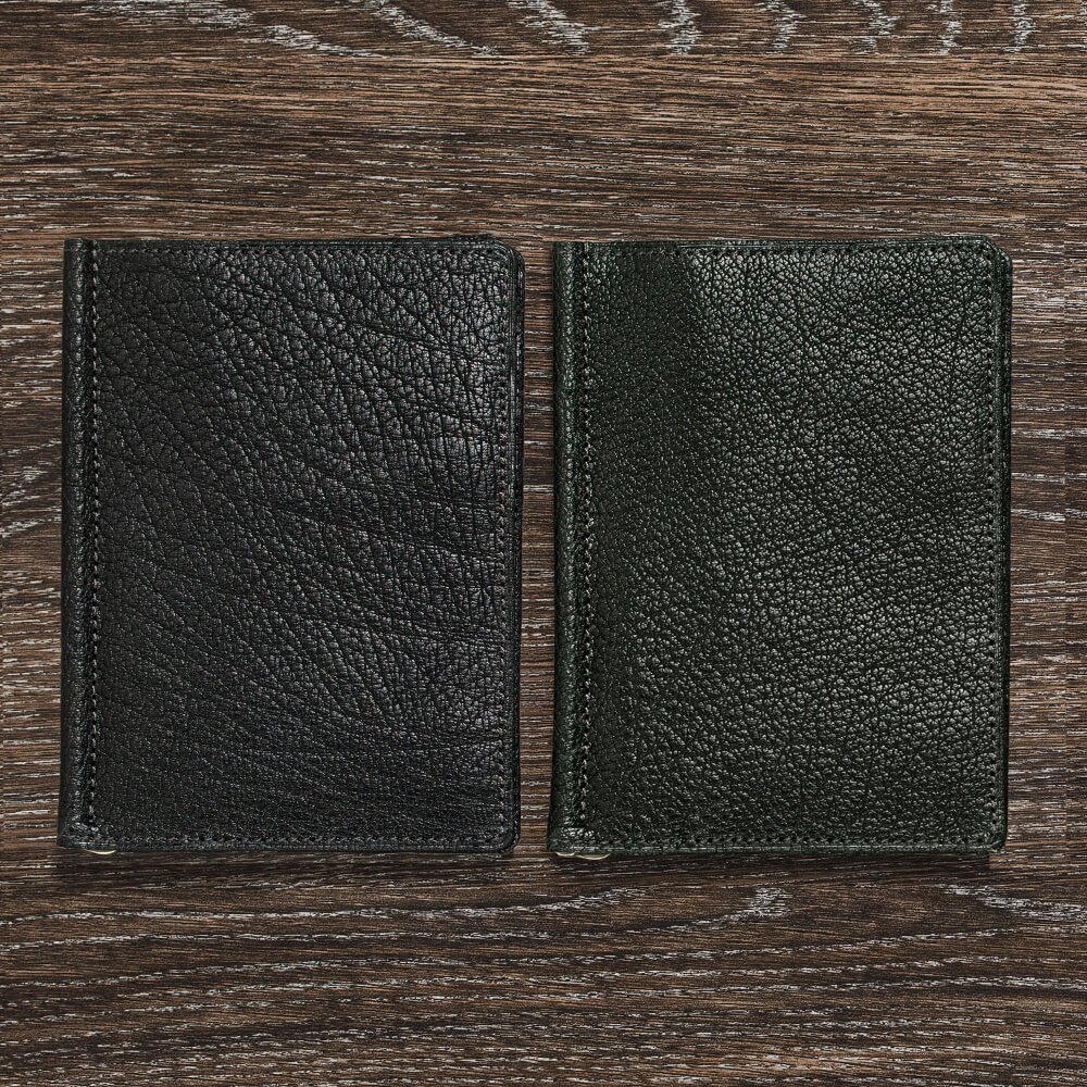 arrow_マネークリップ01に使用されているP&Dバッファローカーフの特徴はその独特のシボ感。細かいシボが規則正しくならんでいるようにも見えるものもあれば、荒々しい表情が強い個性を演出してくれるものもある。どちらにも代えがたい魅力があるので、是非、悩んでいただきたい。
