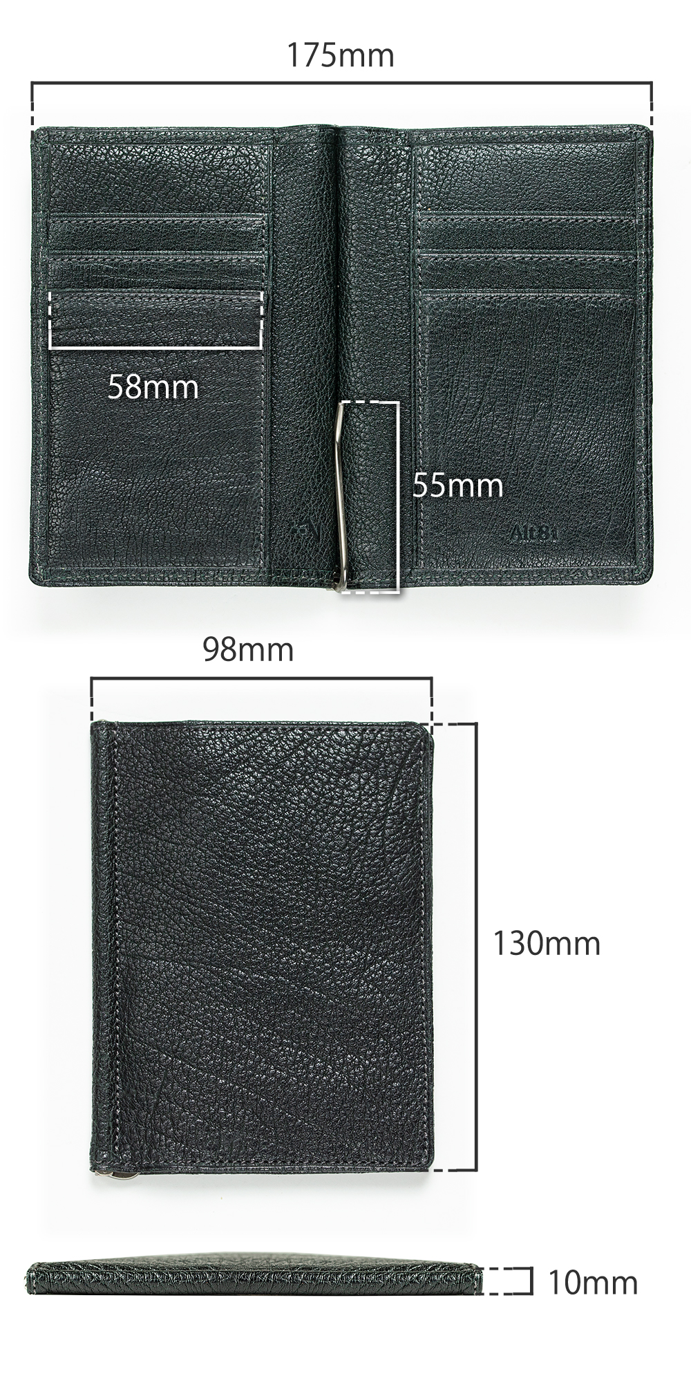 一般的なマネークリップはカードを横にして収納することと日本紙幣の長さを考慮して概ね横幅を11cm程度とっている。しかし、arrow_マネークリップ01は横幅を9.8cmとし、カードを縦に収納する縦長とした。紙幣は金属だけで留める方法もあるが、人によっては紙幣がV字にならないよう片側を留めておく場合もある。その場合も利き手に左右されないように両カード段の裏は紙幣を挟めるようになっている。