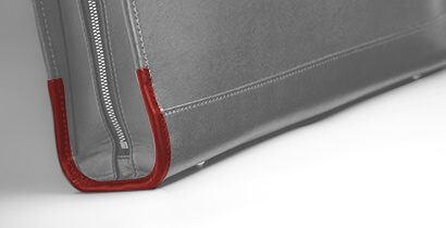 使い続けるとどうしても傷みやすい箇所が出てくる。Alt81は安心して長く使えるようにあらかじめ使用中に起こりうる事例を考慮し、念入りな補強を施している。例えば下マチ部分。物や人にぶつかって傷みやすいこの箇所はヘリ巻き(革で包みこむ)で補強し、万が一、革が擦り減ったり削れた場合には革のパーツを交換出来る仕様にした(※下図・赤)。同様に底も万が一傷んでしまったことを考え、全面換装ではなく、部分換装が可能な設計にしている。鞄の側面というのは正面で向き合った時に意外と相手に見られている箇所。カチッとした印象を与えるtrack_ブリーフケース03だからこそ一層意識して設計と作りに工夫を重ねた点だ。