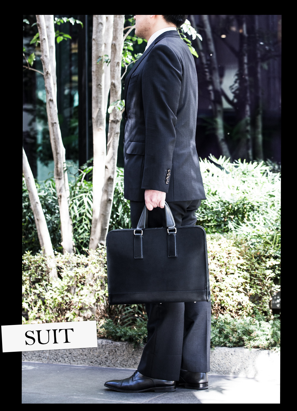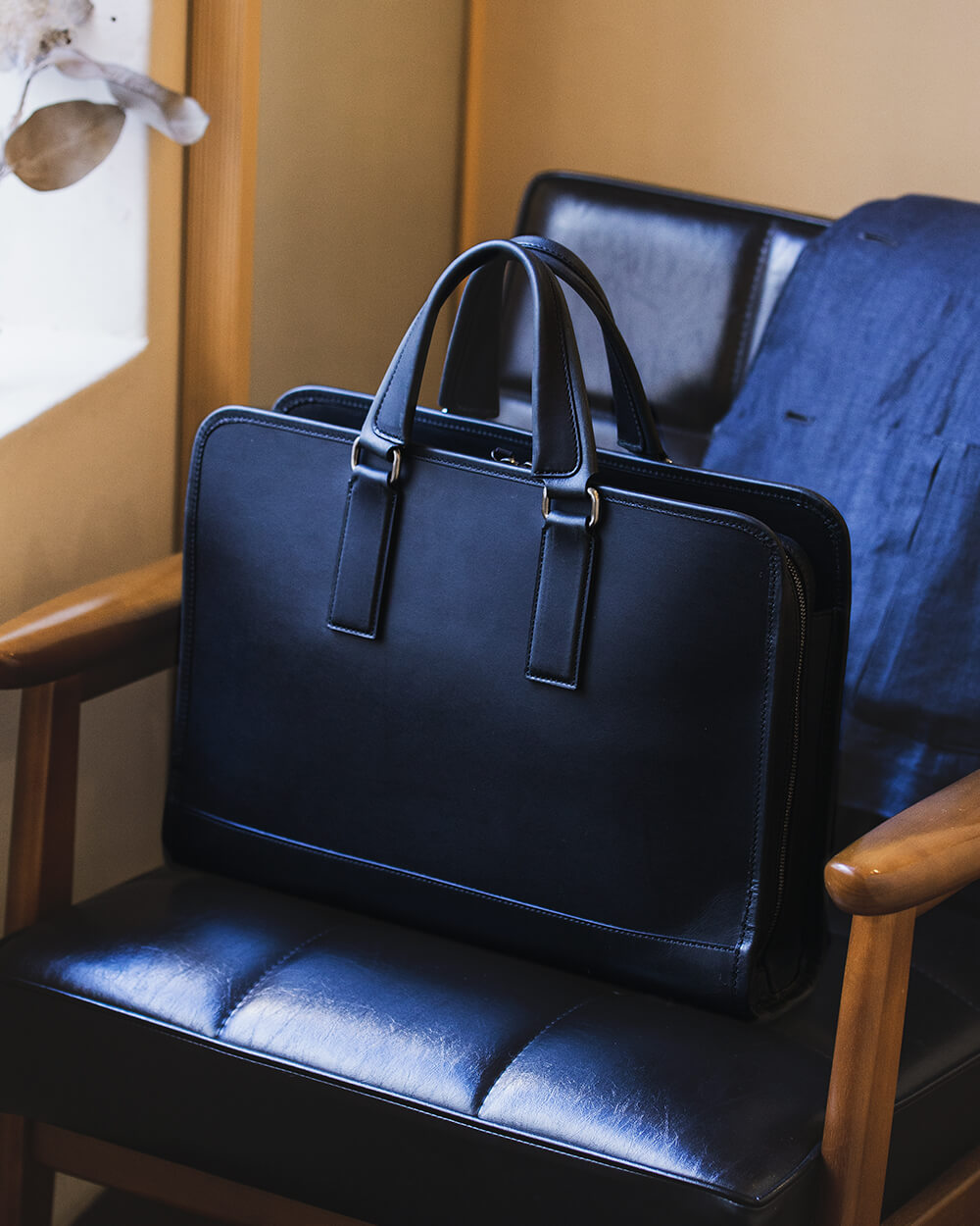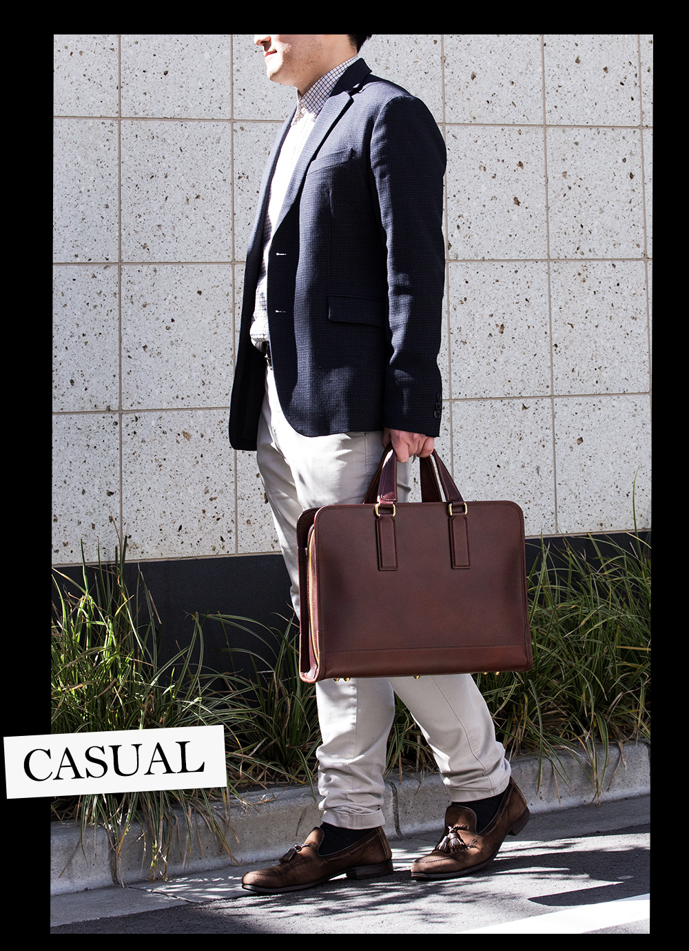 スーツでもジャケットでもカチッとしたスタイルであれば違和感なく合う。ブリーフケースが主張しすぎることはないが、しっかりと存在感を示してくれるだろう。