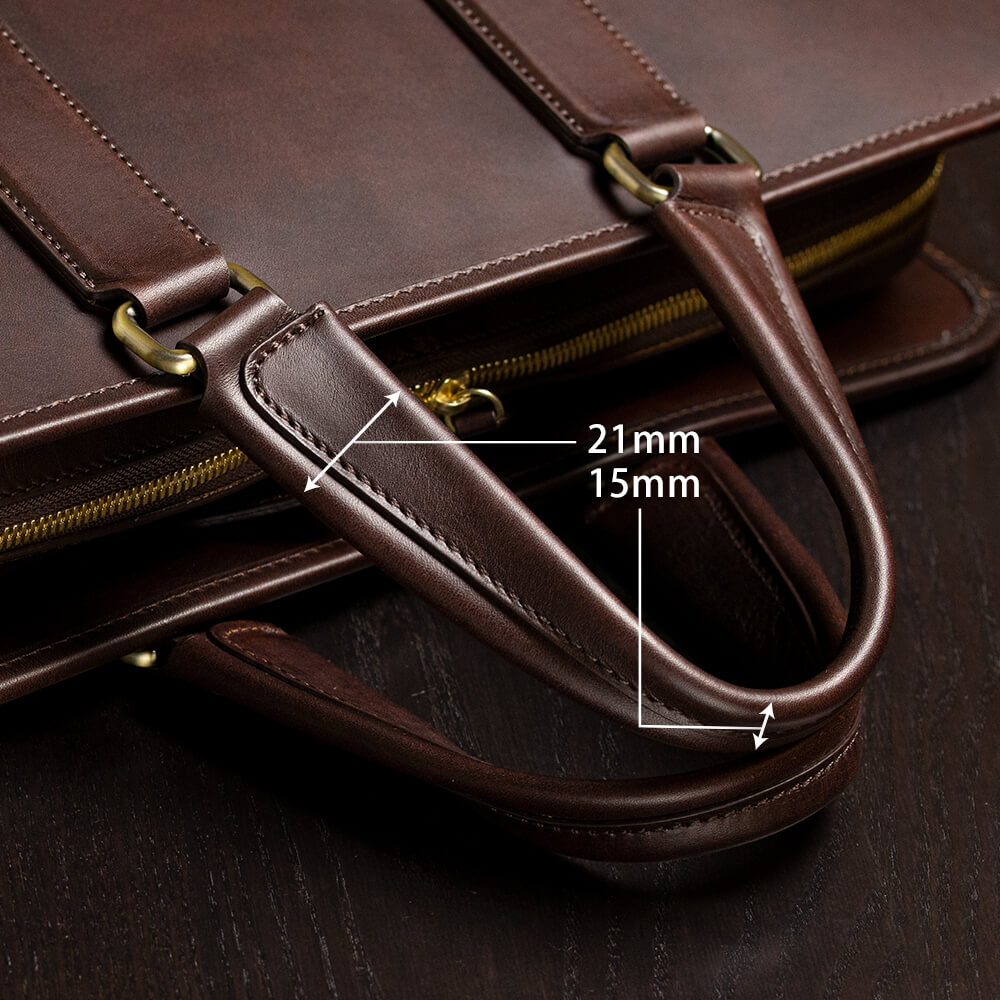 ブリーフケースにとって要となるのがハンドル。Alt81が求めたのは長時間持ち歩いても手が痛くなりにくい形だ。とくにtrack_ブリーフケース03は容量があり、鞄が重くなりやすいので可能な限りの工夫を込めた。まず、ハンドルを革で作る際に出るコバ面(革の切断面)が手に当たらないようにするため、革を1枚かぶせて丸みの帯びた設計にした。こうすることで握っても角部分が手に食い込むこともなく、程良い革の厚みとともに手にフィットする。さらに握りやすい太さも追求。トップに向かって細くなるようにテーパー(角度)をつけ、握りやすさと共にすっきりシャープな印象を持たせている。