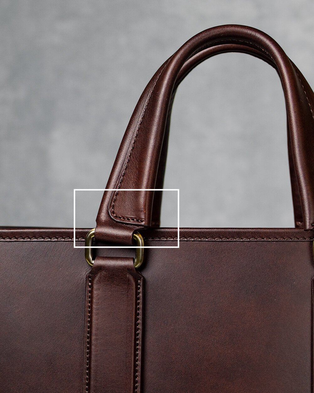 ハンドルは形と同時に荷物の重みに耐えられる強度と耐久性も求められる。Alt81はハンドルと接続する金具の角カン部分に強度が増すよう内側と外側の両方からステッチを施した。作業の手間は増えるが重みの負荷がかかりやすい箇所だからこそあらかじめ入れた工夫である。また、ハンドルには伸び止めを入れ革の伸びを防ぎ、さらに根革(ハンドルを鞄の本体に取り付ける革部分)にも伸び止めを入れるひと手間を加え補強している。