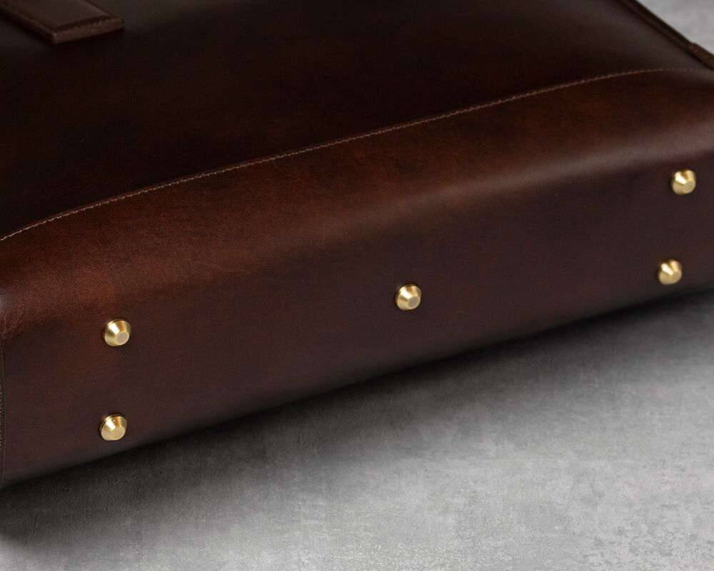 底面には重厚感が漂う真鍮削り出しの金具を使用。鞄を直接、地面に置くよりも革の傷みは和らぐのは勿論のこと、鞄を地面に置いた時の「カツッ」と鳴る音が心地よく、高級感が漂う。普段使っている際には見えない部分だが、あるのとないのとでは大きな差が出る箇所。そこに真鍮削り出しの挽物を使っていることはちょっとした自信に繋がるだろう。