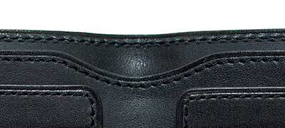 カード段は3段あり、左右両方に配置され計6枚のカードが収納可能。このカード段の縁は「ヘリ返し」と呼ばれる手法によって革が内側に折り込まれ、さらにその上から伸びや切れを防止するためのステッチがかけられているのも実にAlt81の十八番だ。また、このカード段は横幅が少し長く感じるかもしれないが、実はこの幅にも意味がある。前述の自由領域の厚みが増した際、カードが曲がったり、衝撃で折れたりしないようにゆとりを持たせているのだ。しかも、ゆとりを持たせたからといって、革でカード段が形成されているので、緩くなることはない。極めて合理的な作りと言える。