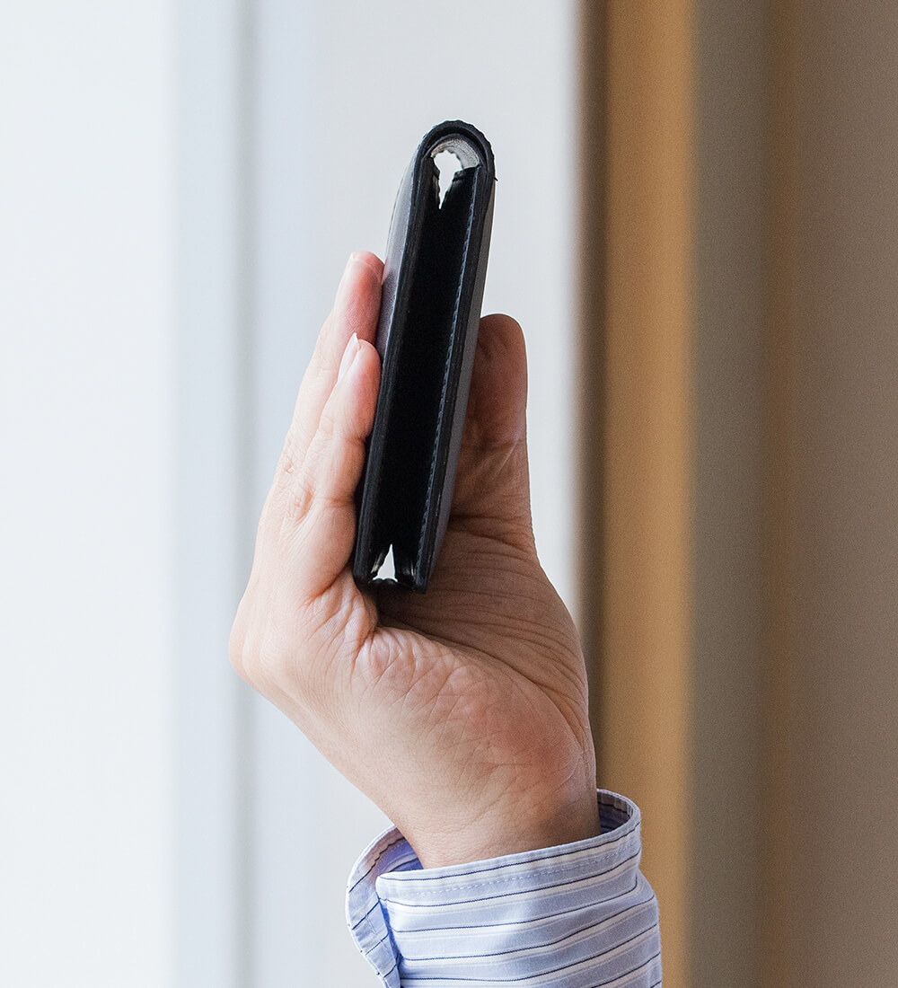 純札入れを知らない方には小銭入れのない二つ折り財布が少し珍しく映るかもしれないが、慣れてしまうとこの形が如何に合理的かがわかる。なぜなら左右対称に作られた形にカードや紙幣を入れていくと均等に厚みが増し、歪みが生じないからだ。きわめてシンプルに使えば厚みは28mm前後になり、スーツの内ポケットにも簡単に収まり、違和感がない。電子マネーの流通で貨幣を使わなくなったと言われて久しいが、この純札入れは流行り廃りの波を意に介さない、強靭な意思を感じる。