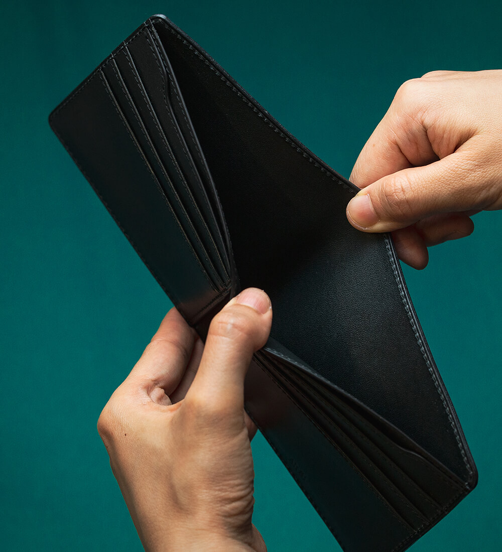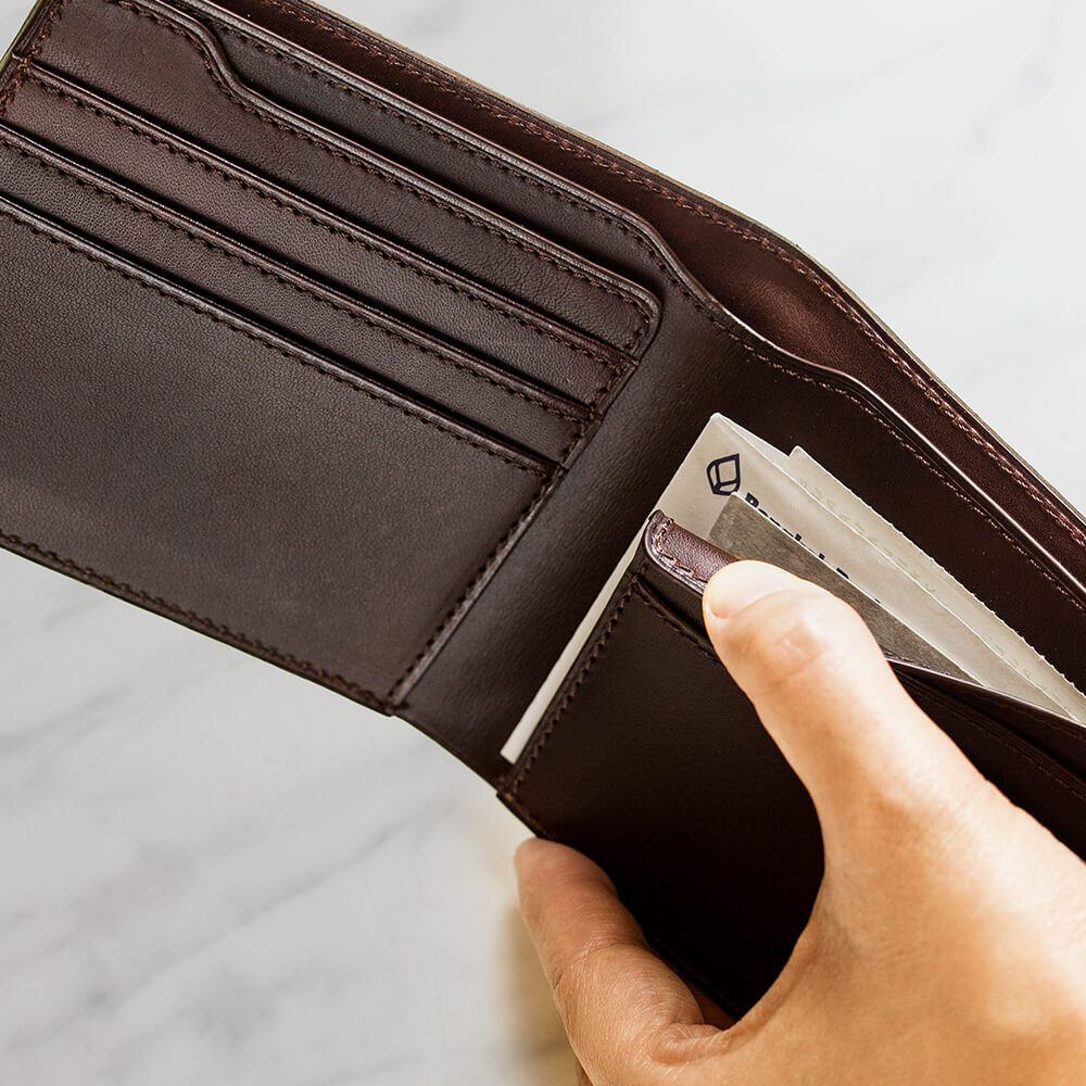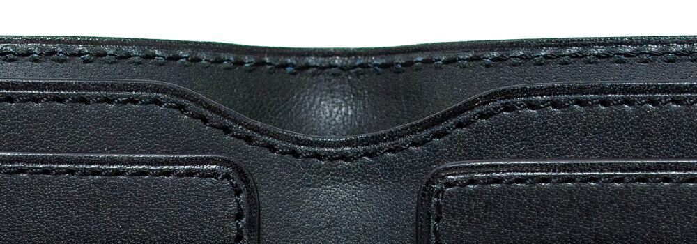 純札入れを開くと、カード段の後ろが少し変わった形状になっていることが気が付くだろう。実はカード段が比翼のパーツになっていて、後ろにカードや領収書などを挟み込めるアオリ状のポケットになっている。ポイントカードや領収書を挟んでも良いし、お札を分けて収納する人もいる、まさに自由領域だ。また、この比翼パーツは大きく開きすぎないように3目程ステッチをかけ中身が落ちにくい仕掛けを施している。自由領域にグッと差し込むと普通に使っていれば、中身が落ちる心配はかなり軽減されるだろう。