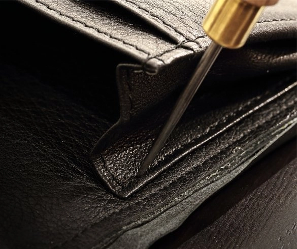 表革には全体をピリッと引き締めるため、「ネン」が引かれている。「ネン」とは革の縁の施される技法のことで、様々な引き方があるが、よりくっきりと見せるためには熱したコテを使い、焼き印のように入れていく。このネンがあるのとないのとでは、機能的な違いはないが、見た目に違いが出てくる。特にカチッとした印象を持たせたいデザインにはネン引きは必須で、その有無によって商品の印象が変わる。