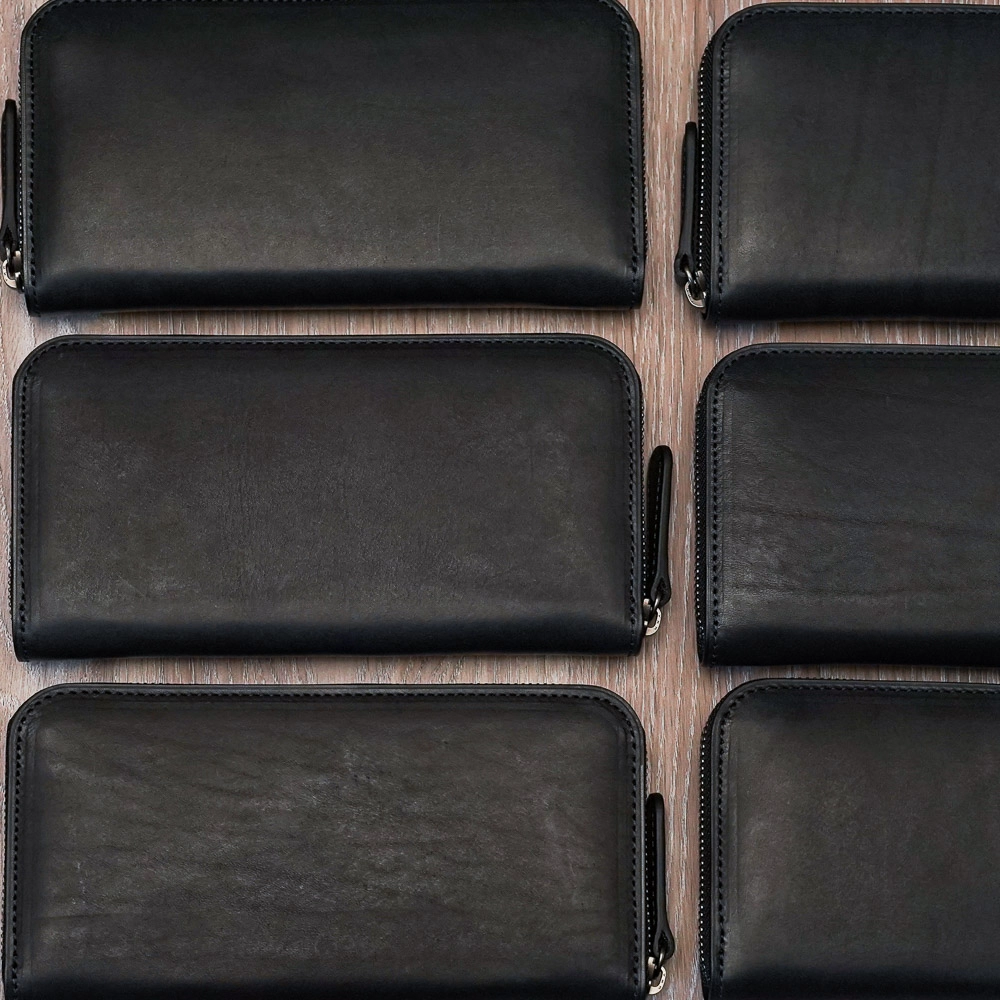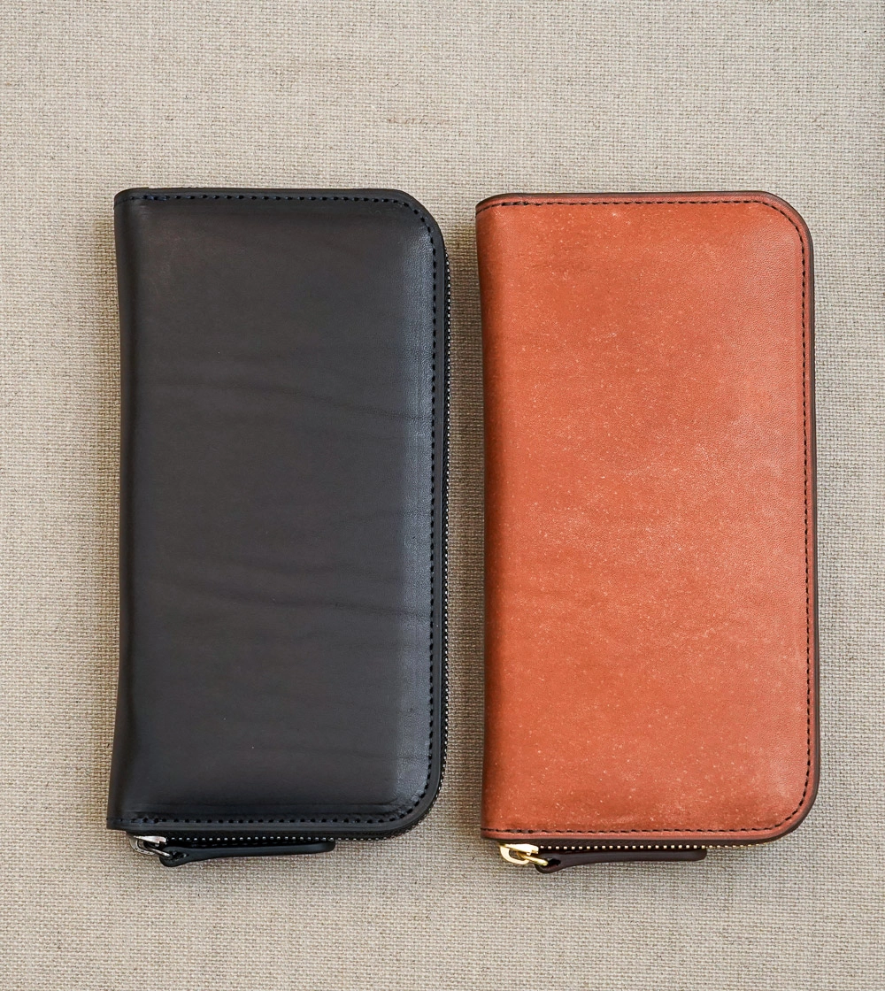 ラウンド長財布の説明に入る前に色の案内をさせていただきたい。今回、ご用意した色は「ブラック」と店舗限定での取り扱いとなる「ブラウン」の2色。使用前のブラックは灰色に近い色味で、ところどころ白みがかかり灰色に見える。これは革に含まれているオイルが表面に現れているためで、ブラウンも同様に少し白さがある。革の表面にある表情は通常であれば仕上げ加工で隠れてしまう模様も、はっきりと見える。「ブラウン」が店舗限定になっている理由も、あまりにもその表情に個性があるためだ。では、この色がその後も続いていくかというとそうではない。約半年もすると、色は大きく変化する。