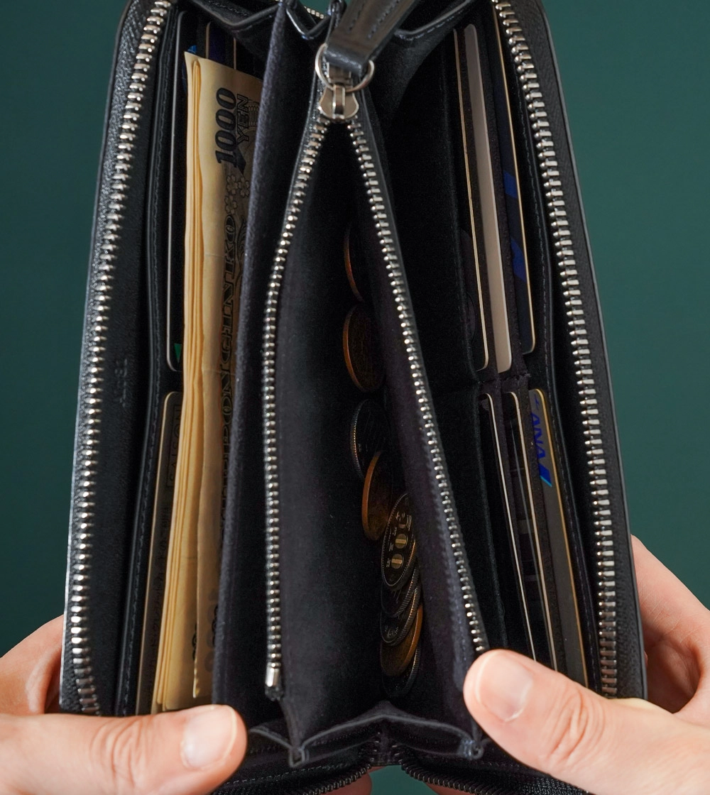 ラウンド長財布の魅力はなんといってもその収納力だろう。用意されているカード収納段は12段、紙幣を入れられるポケットは3カ所もある。さらにカード段の裏にはベタマチ作りのポケットが2カ所あり、用途の説明に困るほど。人によって財布に収めたいものは領収書や御守り、銀行の通帳やパスポートなど多種多様。収納力のあるこのラウンド長財布を鞄に入れておくと、あたかもバックインバックのような存在感があるのはそのためだ。